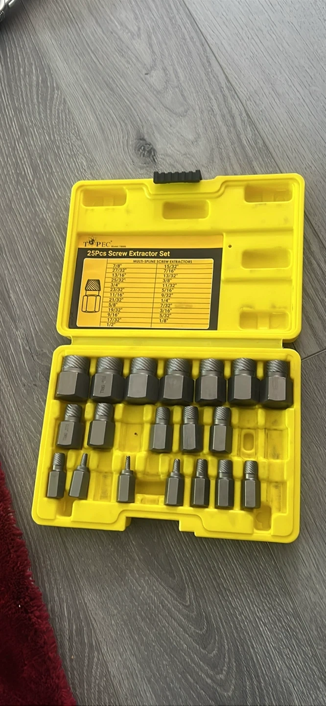 Selling a Topec 25-piece screw extractor set! This set comes in a bright yellow case and includes a variety of multi-spline screw extractors. Sizes included are: 7/8", 27/32", 13/16", 25/32", 3/4", 23/32", 11/16", 21/32", 5/8", 19/32", 9/16", 17/32", and 1/2". Multi-spline screw extractor sizes include: 15/32", 7/16", 13/32", 3/8", 11/32", 5/16", 9/32", 1/4", 7/32", 3/16", 5/32", and 1/8".