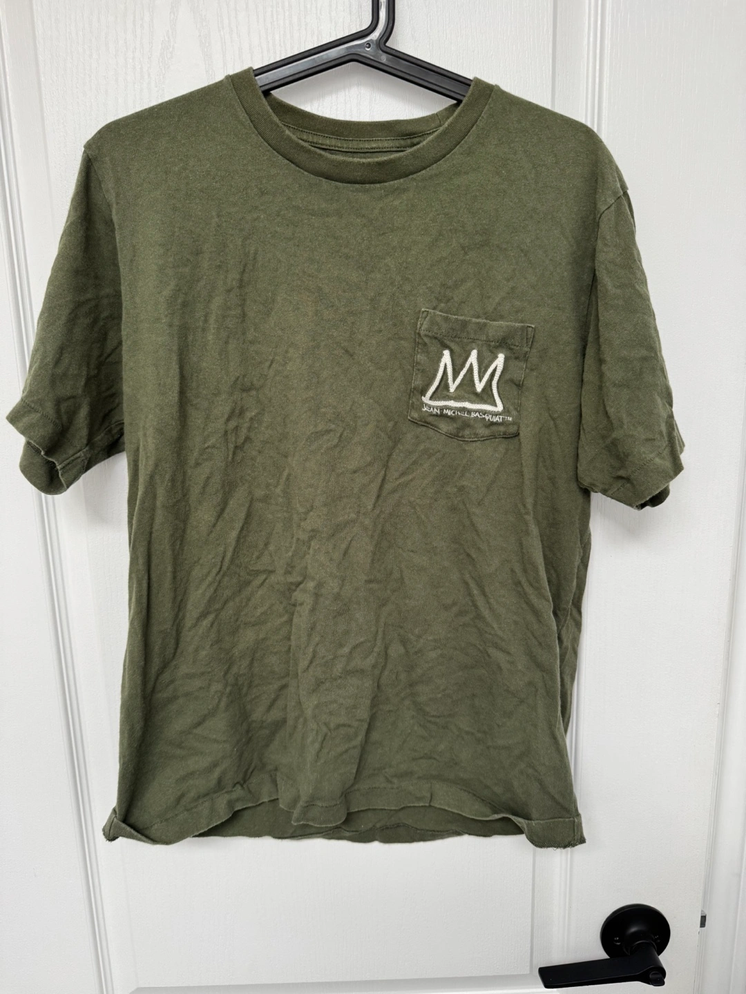 Here's a Uniqlo Jean-Michel Basquiat t-shirt in olive green! It features a unique design on the pocket and a small crown logo on the sleeve. A comfy and stylish piece for any fan of the artist
