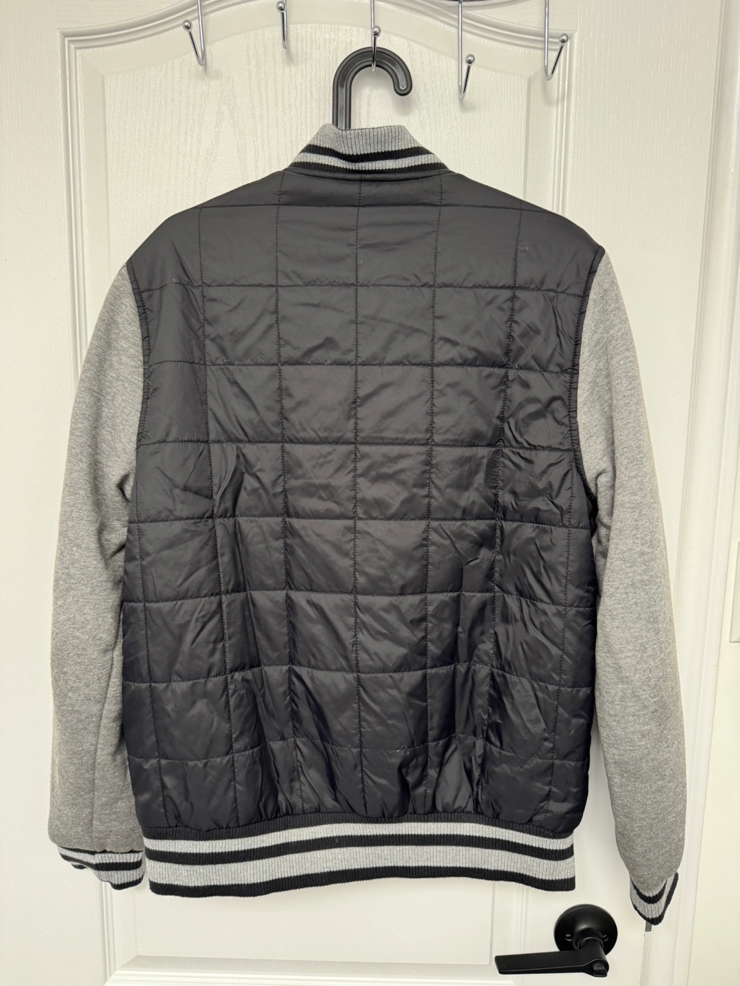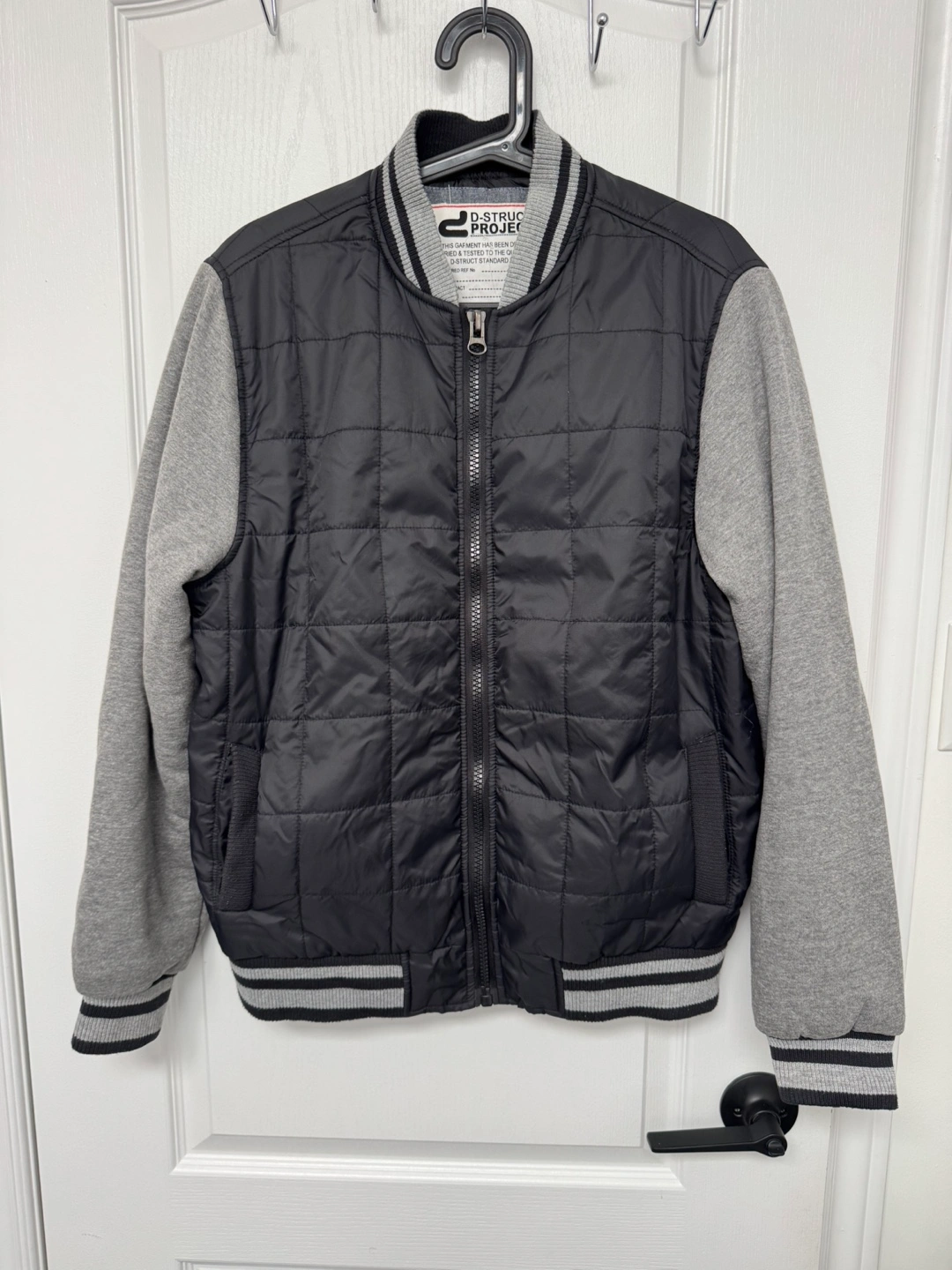 Here's a District Project bomber jacket in great condition! It's a stylish black quilted jacket with grey sleeves. Perfect for adding a bit of warmth and style to your wardrobe