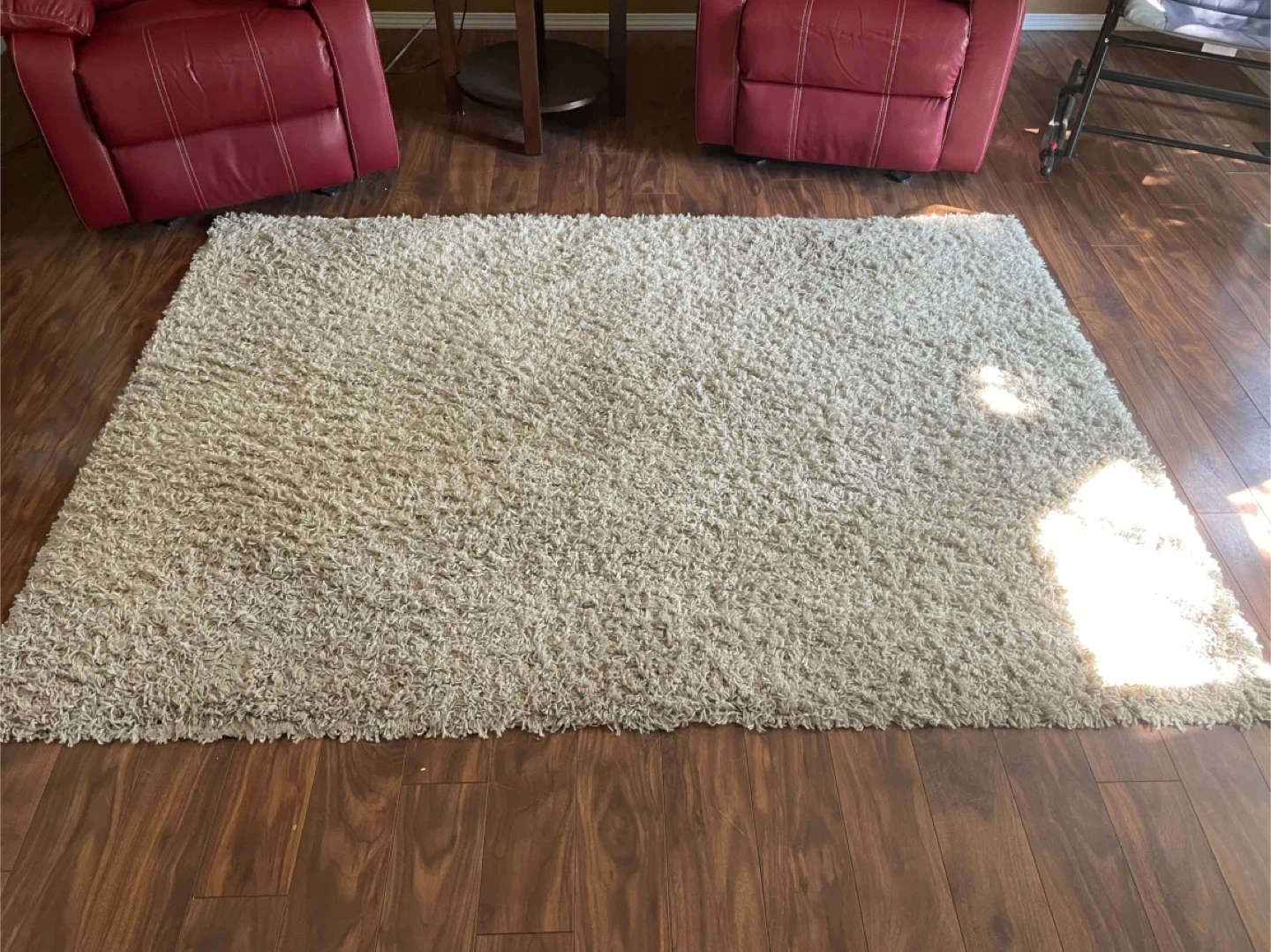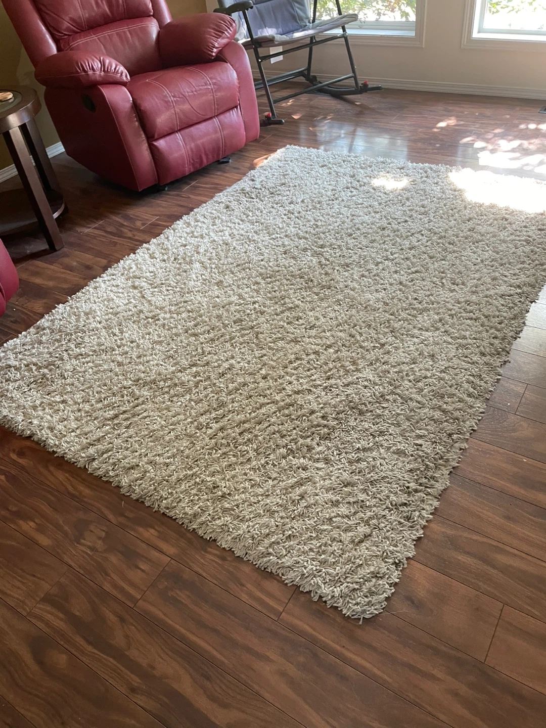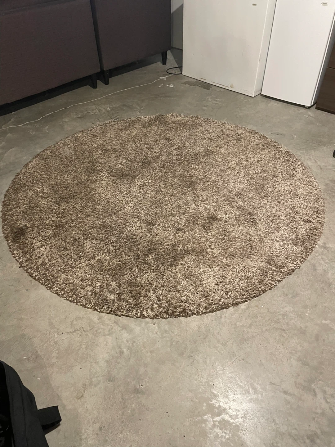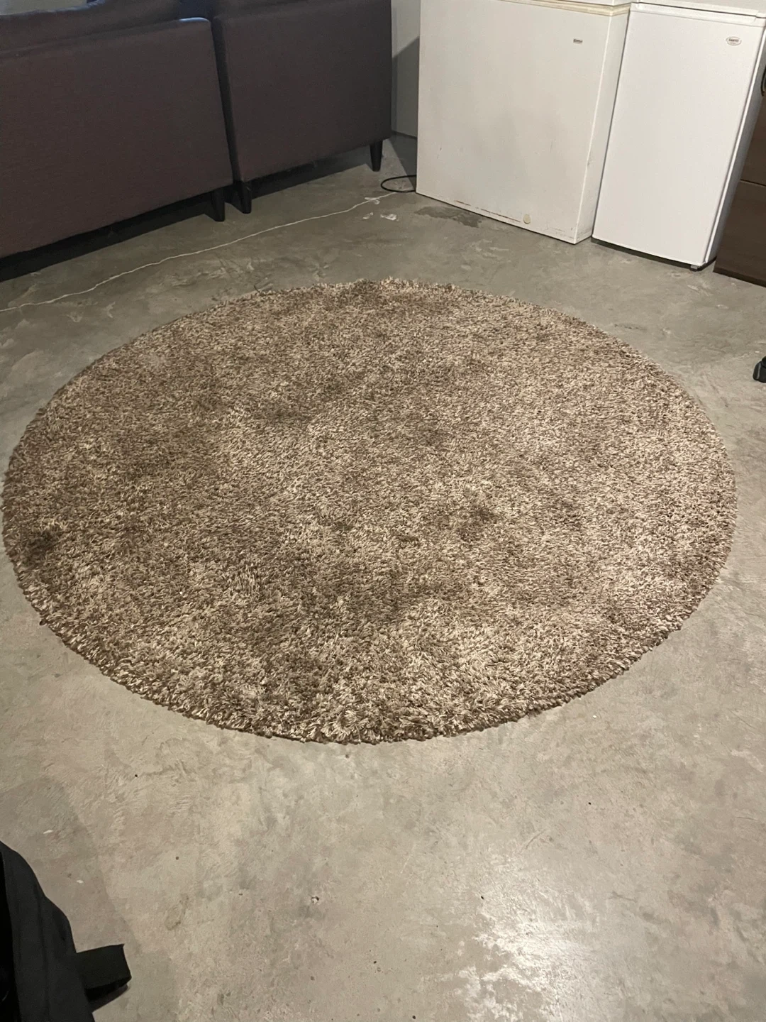 Free, one oblong and one round area rugs, cozy, beige round shag rug. It's in great condition and would be a lovely addition to any room. The shag material adds a soft and warm feel to your space. No pets in the home