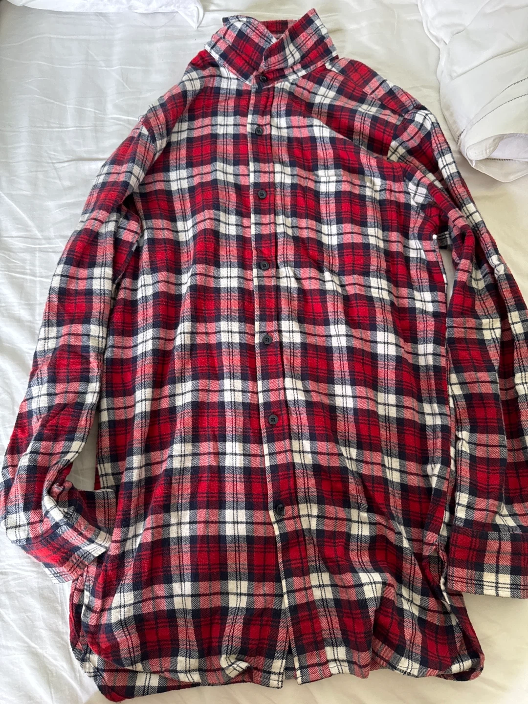 Here's a comfy-looking red plaid flannel shirt! It's perfect for layering or just wearing on its own. The classic plaid pattern gives it a timeless look, great for casual outings or cozy nights in. It's in good condition and ready for a new home!