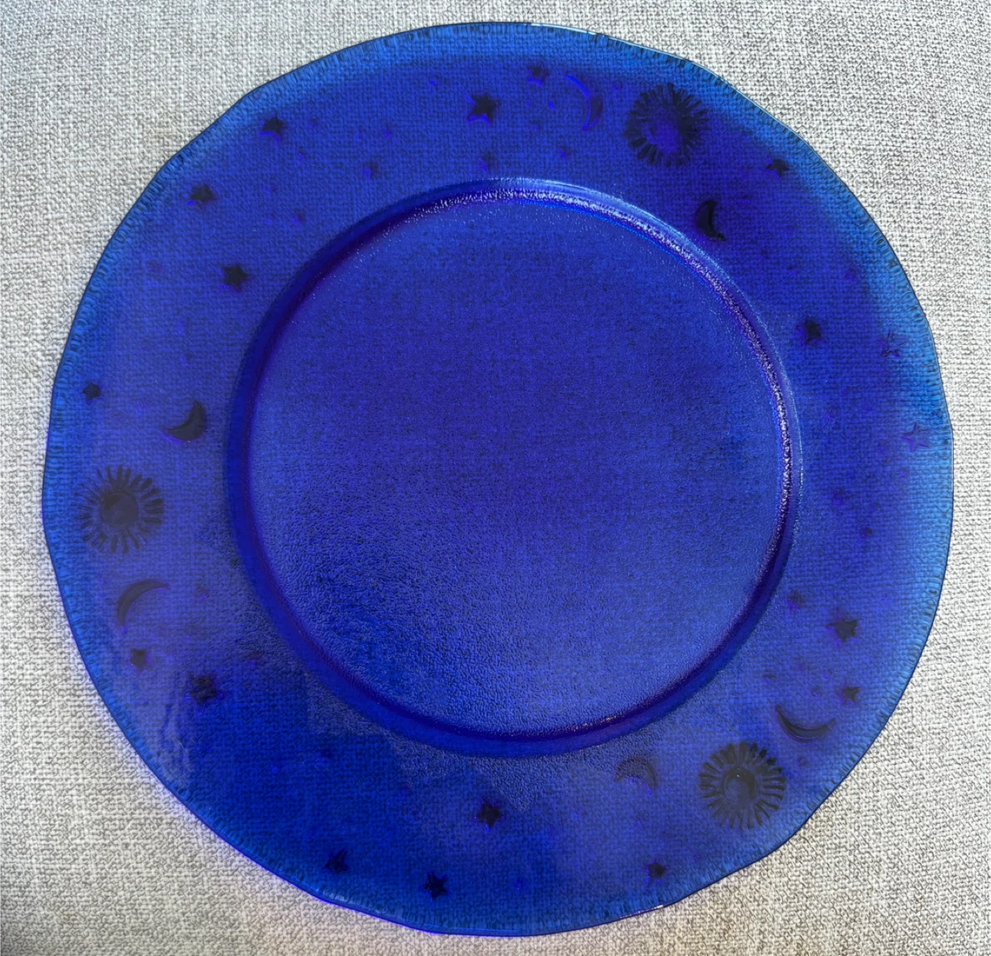 Selling a beautiful blue glass plate with a celestial design! It features sun, moon, and star motifs around the rim. Perfect for adding a touch of whimsy to your table setting. Open to offers!