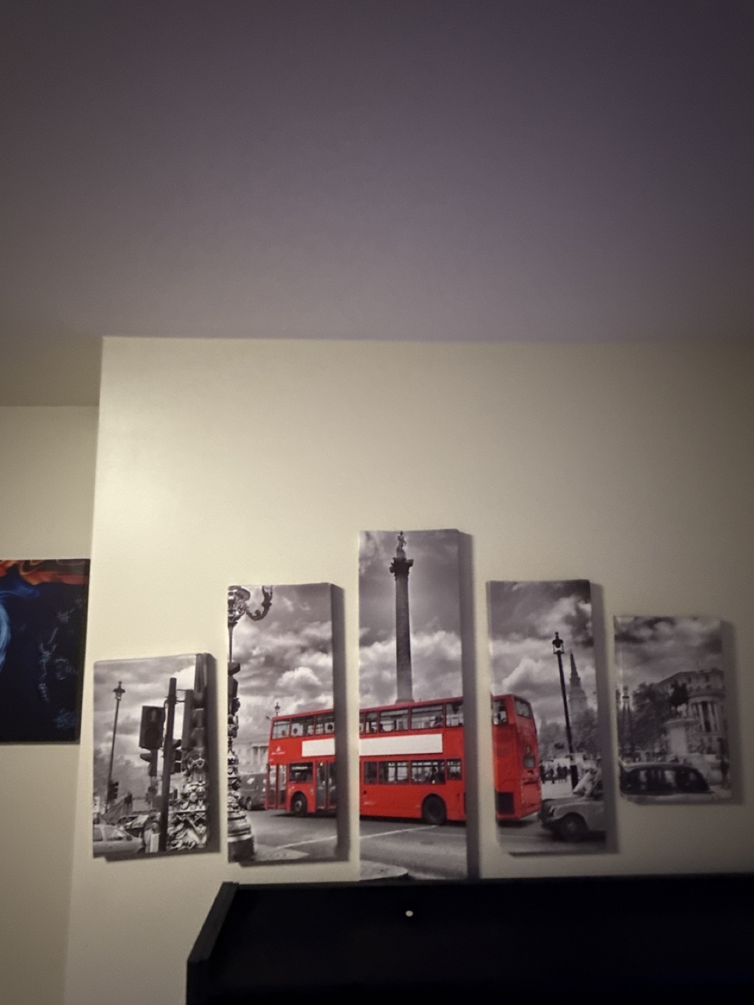 I'm selling a canvas wall art set featuring scenes of London, including the iconic red double-decker bus and other landmarks. It's a great piece to add a touch of British charm to any room!
