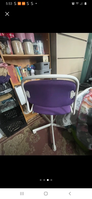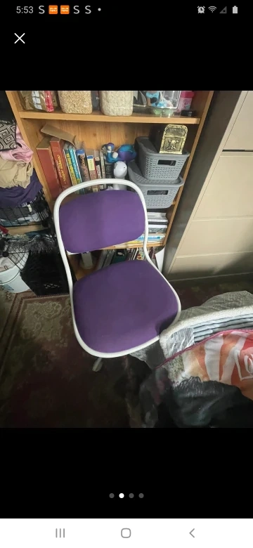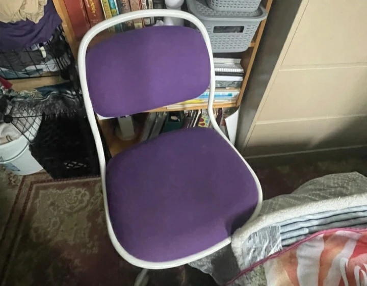 Here's a comfy purple desk chair! It would be great for a student or home office setup. The chair has a white frame and a purple seat and back. It's in good condition and ready for a new home $25