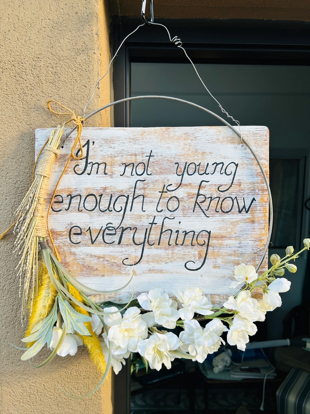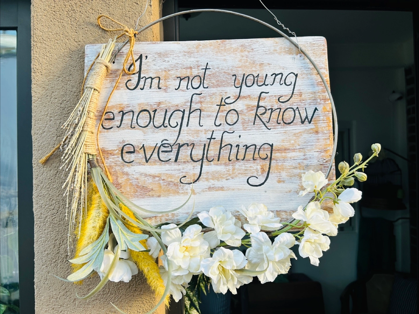 This is a beautiful, handmade wreath sign that reads, "I'm not young enough to know everything" It has a rustic, charming look with artificial flowers and natural elements. Perfect for adding a touch of whimsy to your home decor