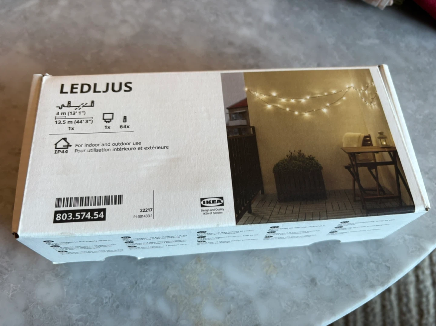 Selling a brand new IKEA LEDLJUS string light set! It's still in its original packaging and has never been used. Perfect for adding a cozy touch to any indoor or outdoor space. The string is 4 meters (13'1") long and features 64 lights. The box includes the lights, a power adapter, and instructions Pickup at King St W and Shaw