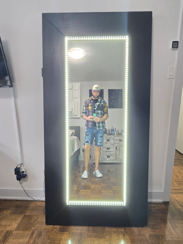 Selling a full-length mirror from Ikea (75" x 37"). The frame is a solid wood chocolatey brown (it's heavy). I added LED lights which make it perfect for getting ready. The lights are on a switch - you can turn them on or off, or dim them. If you don't like them, you can peel them off the glass easily. The mirror is in great condition and ready for a new home. There's a couple of minor dings on the corners, but I've colored them in with a wood Sharpie. You must pick it up because I don't have a car to deliver it. I'm more than happy to help you carry it out.