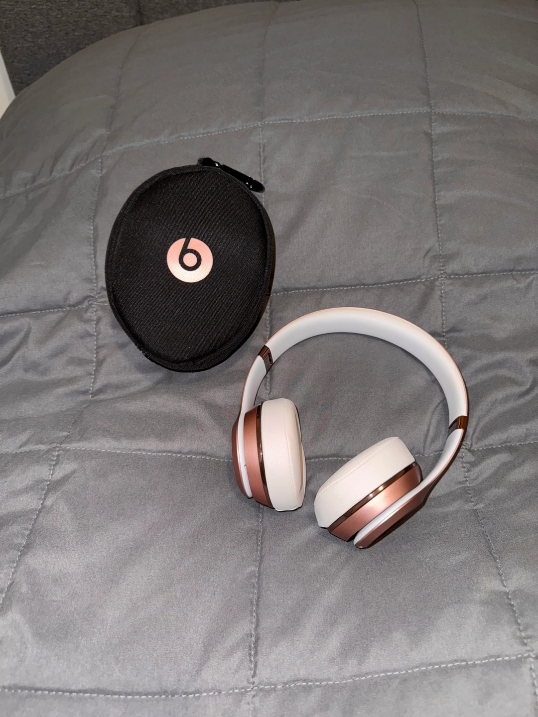Selling a pair of Beats Solo3 wireless headphones in rose gold! They come with a carrying case to keep them safe on the go