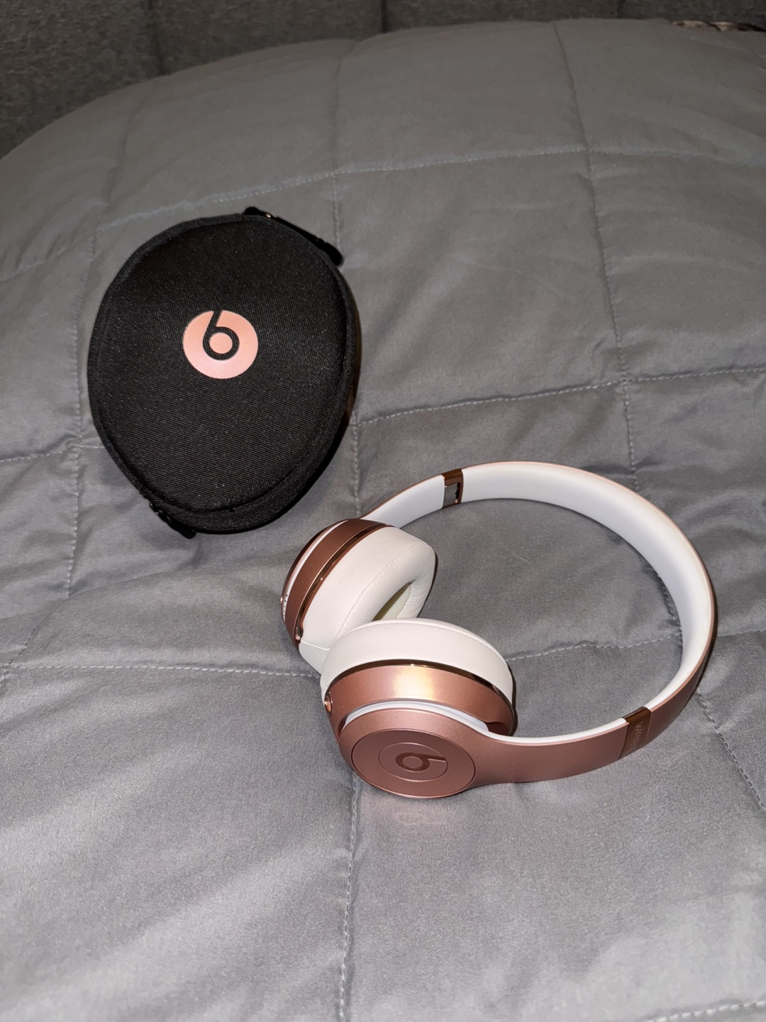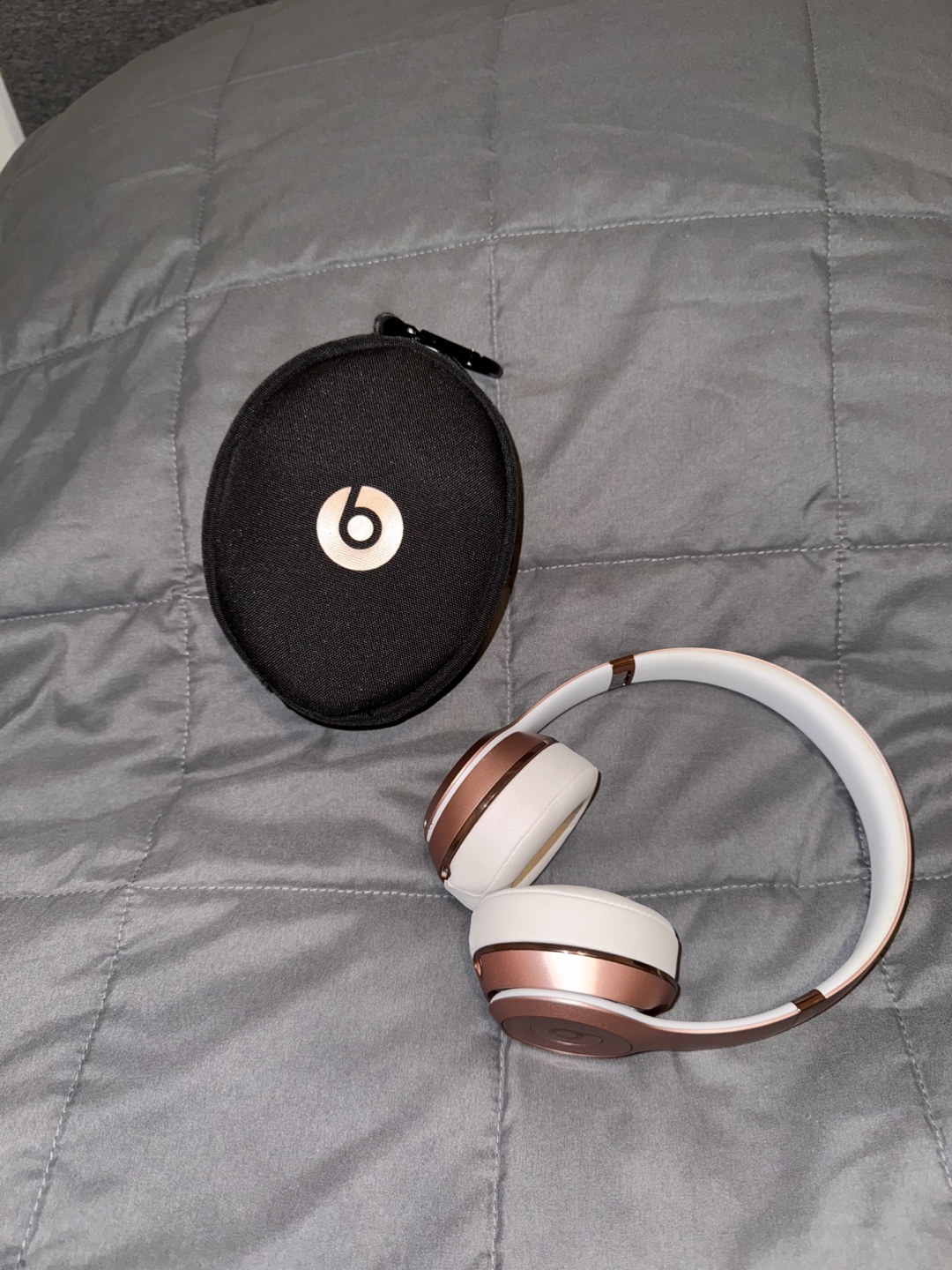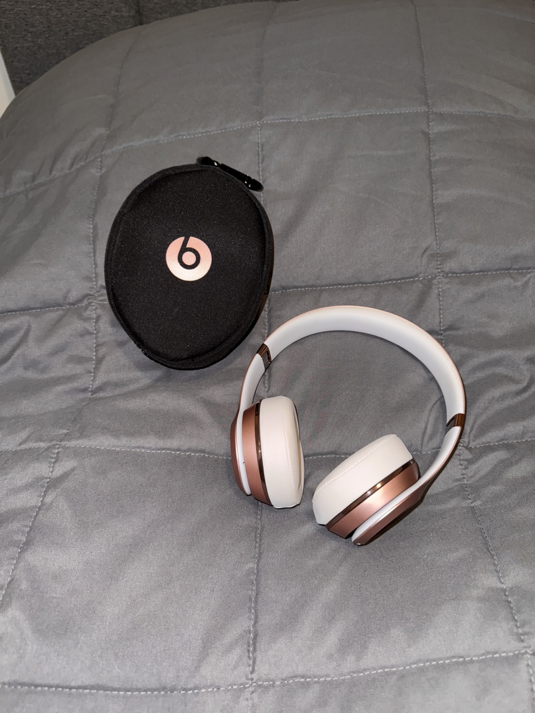 Selling a pair of Beats Solo3 wireless headphones in rose gold! They come with a carrying case to keep them safe on the go