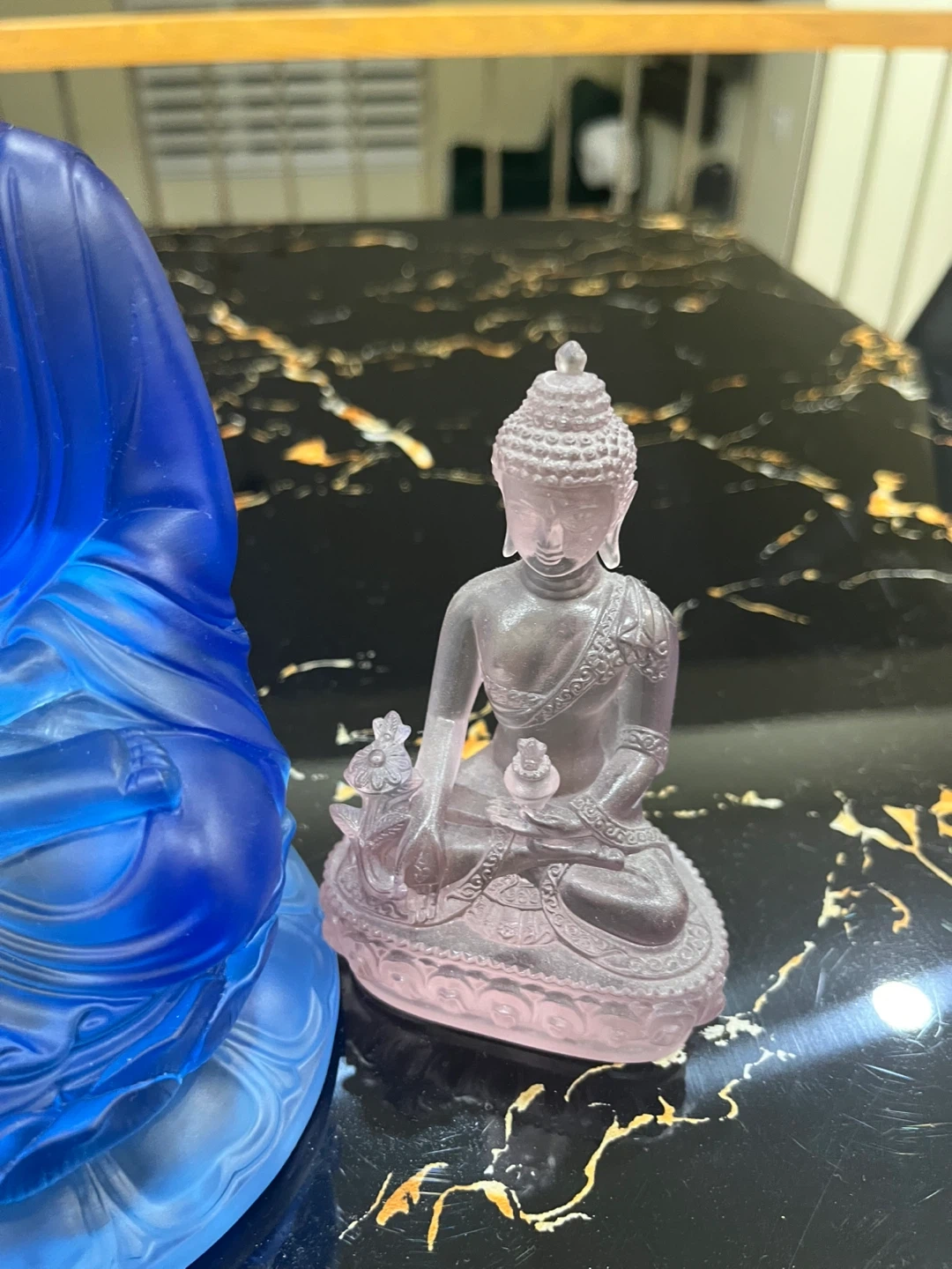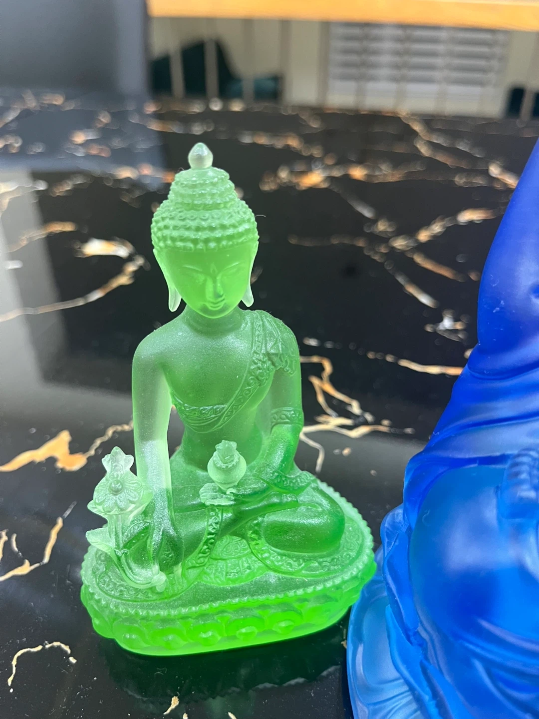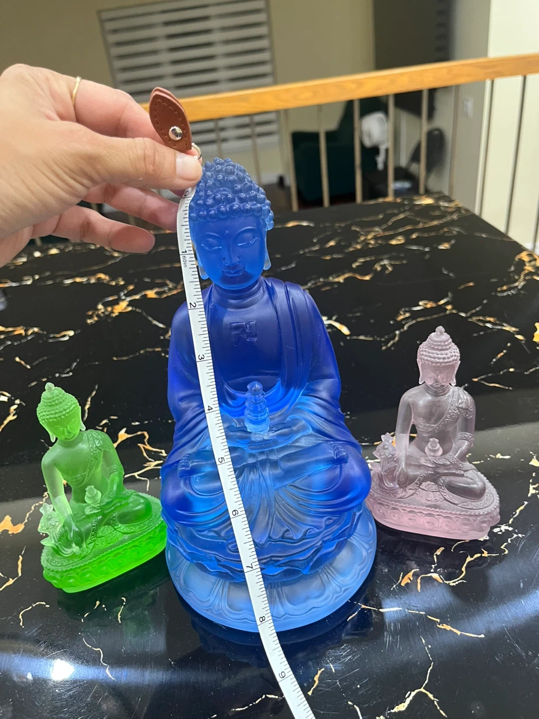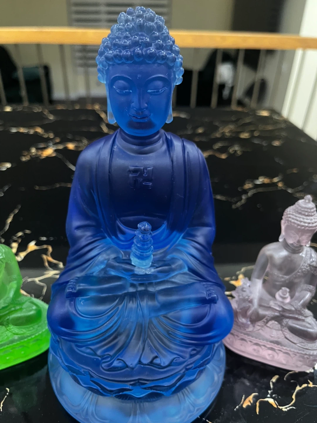 76Selling a set of three Buddha statues in blue, green, and pink. They are in good condition and would make a lovely addition to any home or meditation space! The blue statue is approximately 9 inches tall. $25 for blue And small one for $15 each