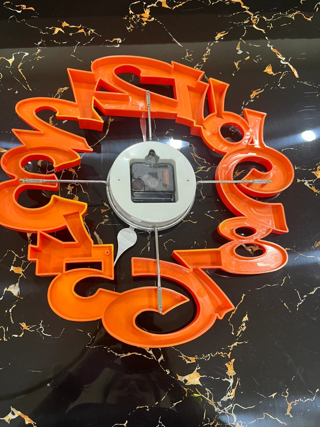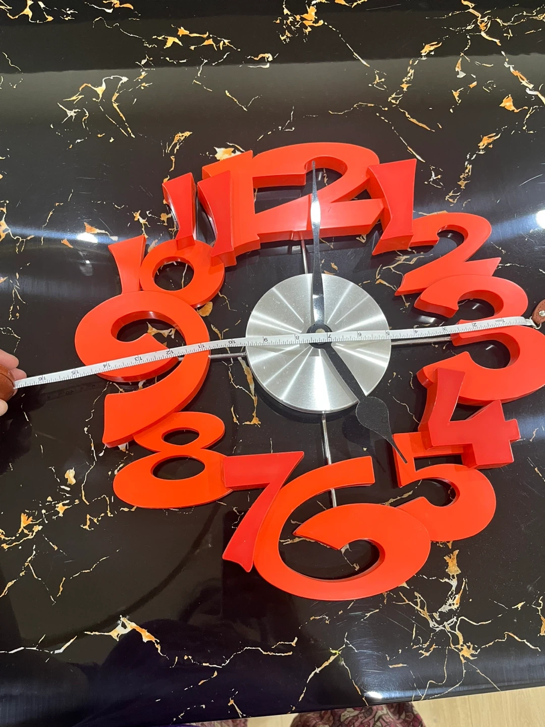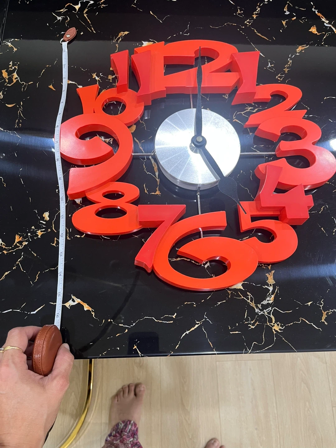 76Here's a unique wall clock featuring bold red numbers! It's quite the statement piece and would add a pop of colour to any room. The clock is in great shape and ready to tell time in its new home