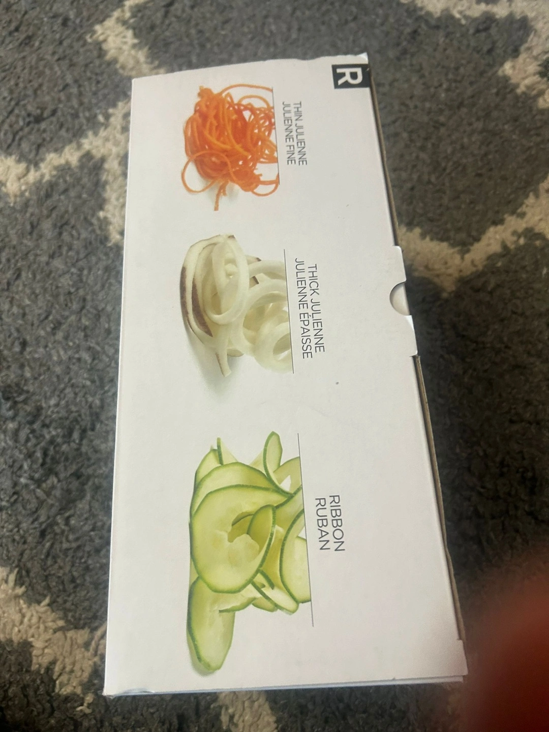 I'm selling a brand new Ricardo Spiralizer still in its original box! It's perfect for making veggie noodles and spirals. The box shows it can make thin julienne, thick julienne, and ribbon cuts. It's also BPA free!