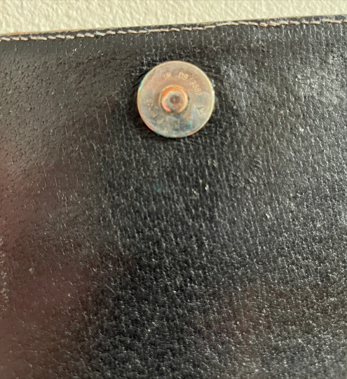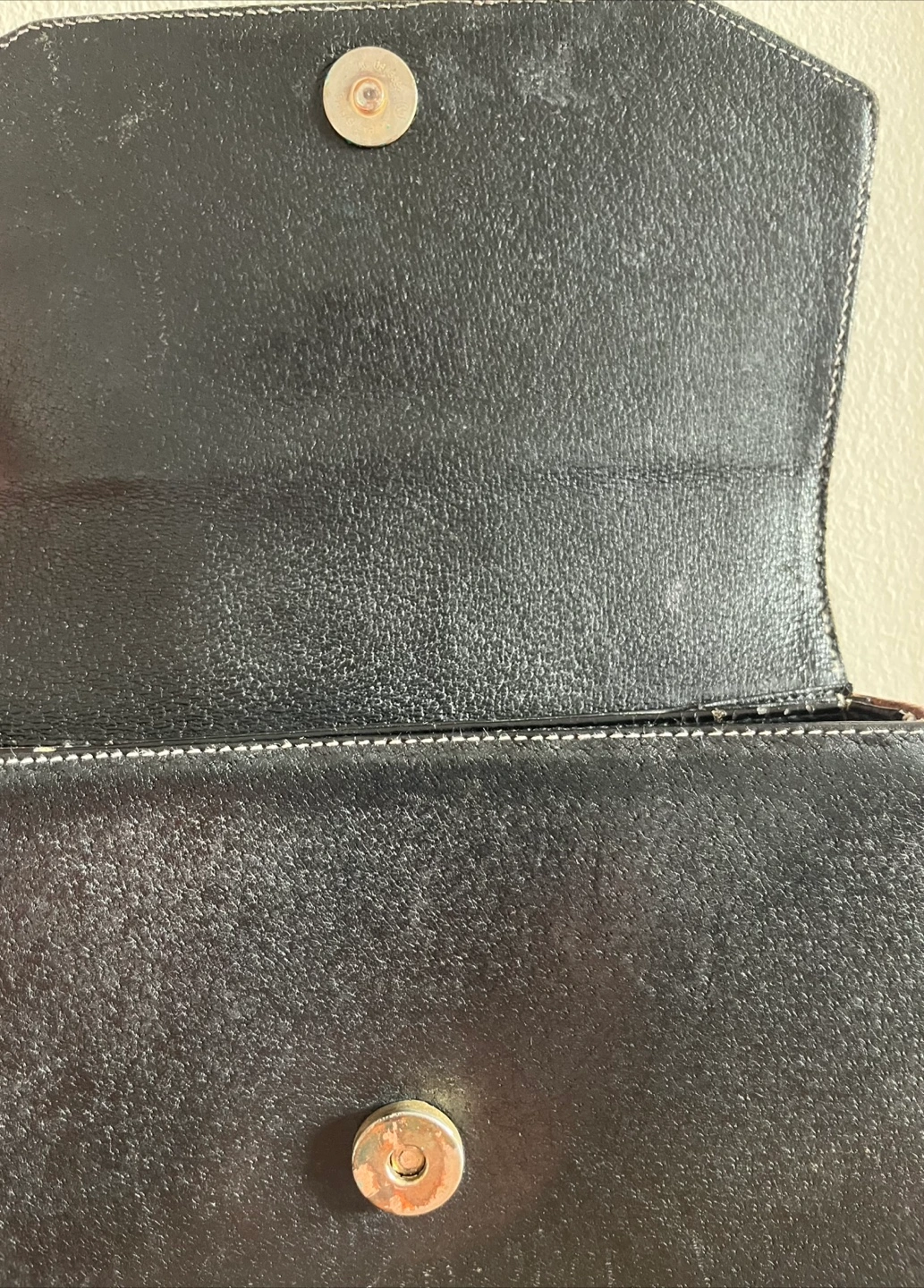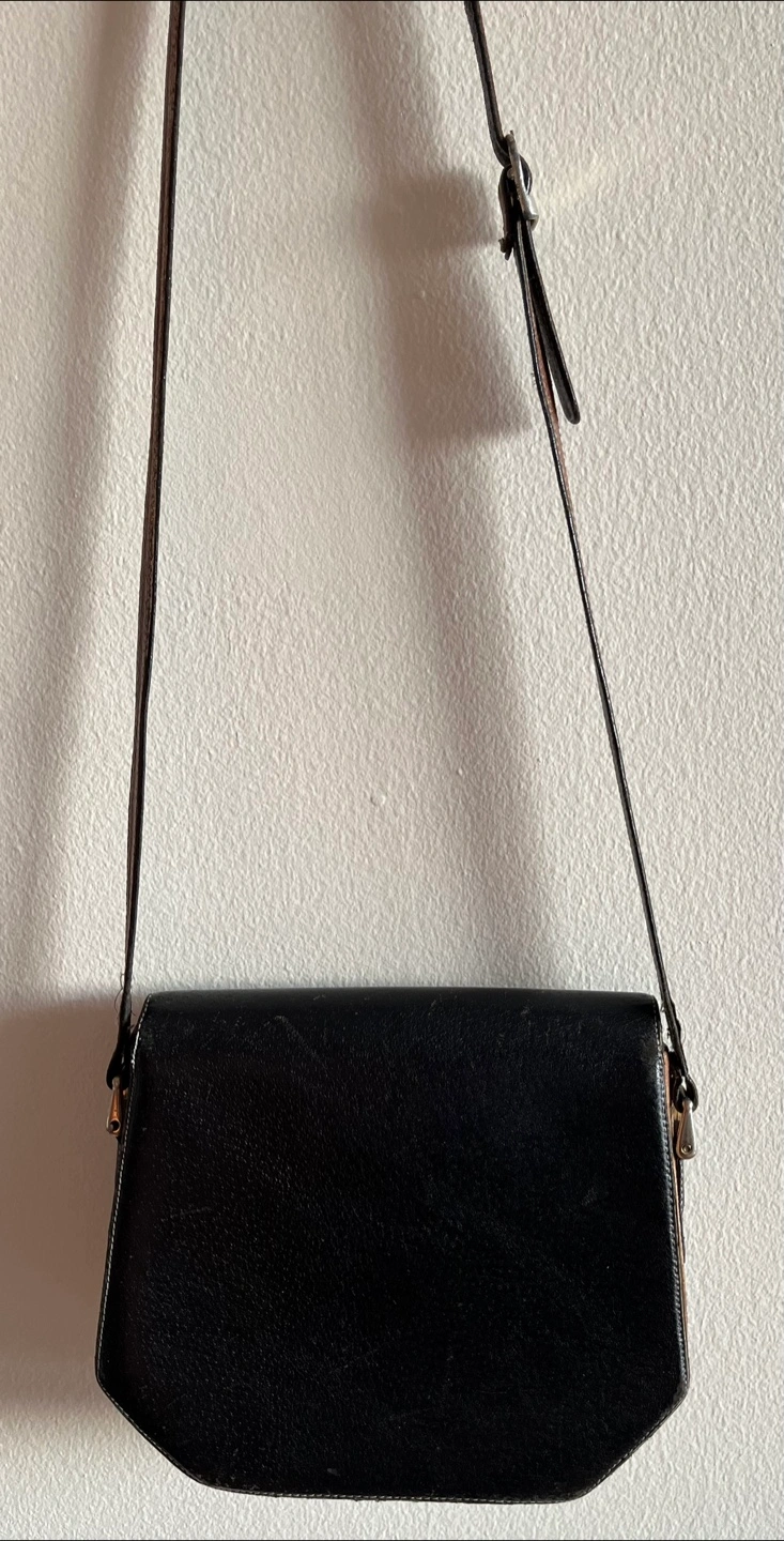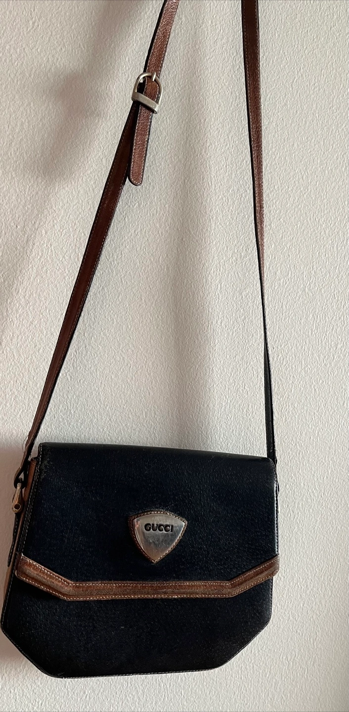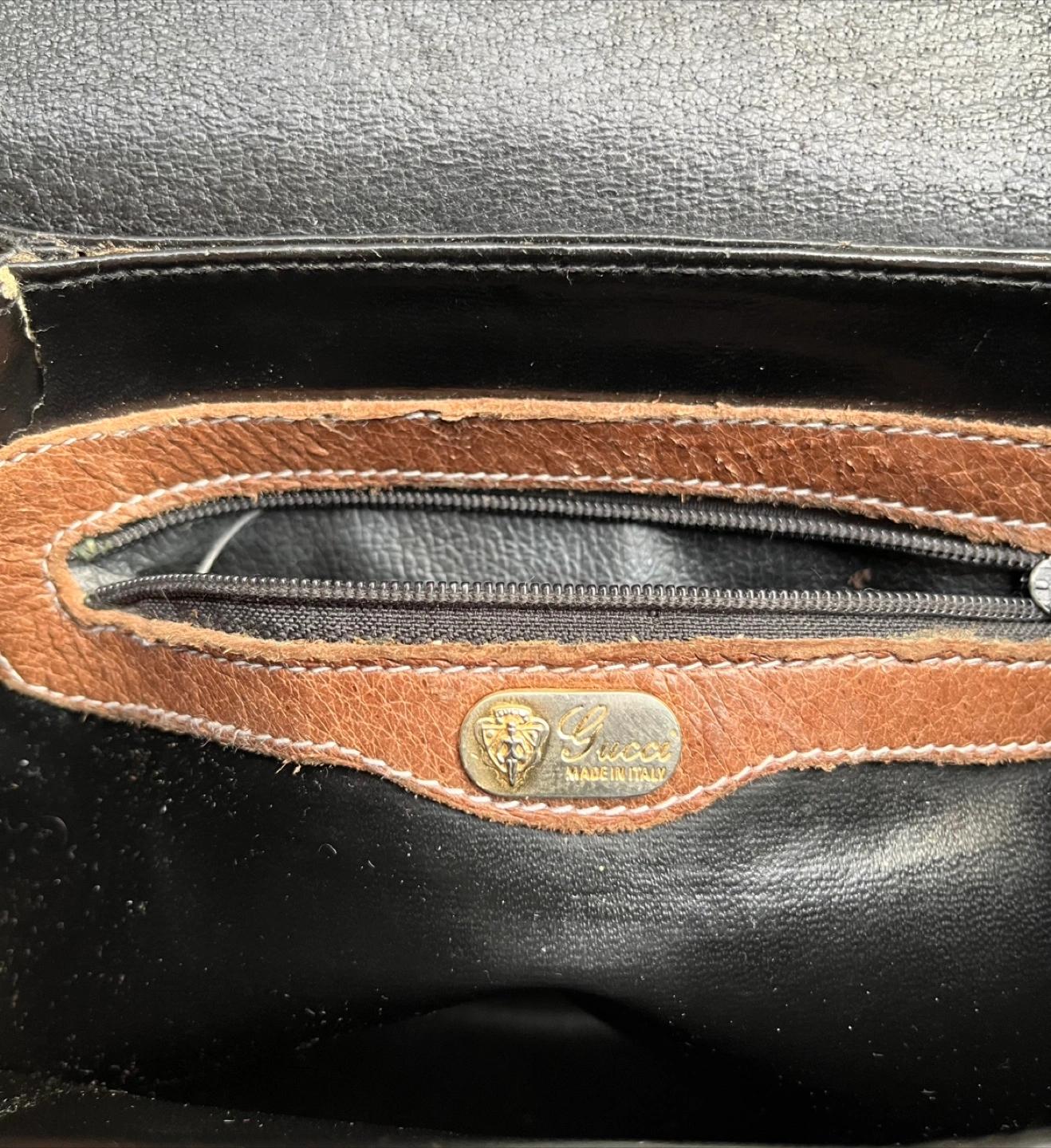 Selling a vintage Gucci shoulder bag in black leather. Brown leather trim and the classic Gucci logo. It's a stylish piece with a timeless design. There are some signs of wear on leather and hardware.