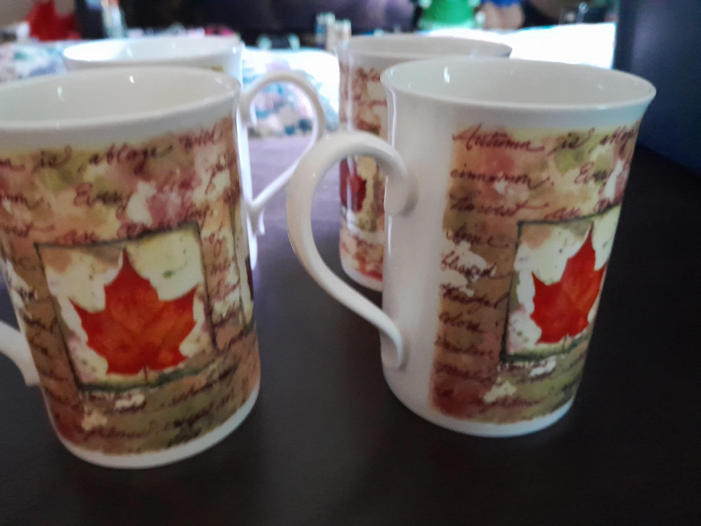 Selling a set of four mugs. Each mug features a lovely maple leaf design, perfect for adding a touch of Canadian charm to your kitchen. They're in great condition and ready for a new home