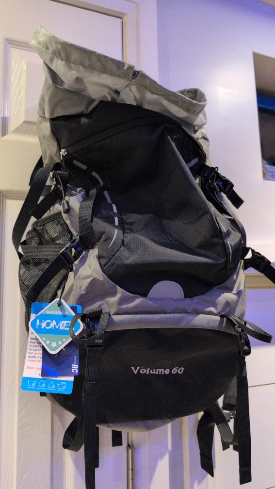 Selling a HOMIEE backpack in grey and black. It's a Volume 60 model, perfect for hiking or travel! The backpack looks to be in great shape and ready for new adventures