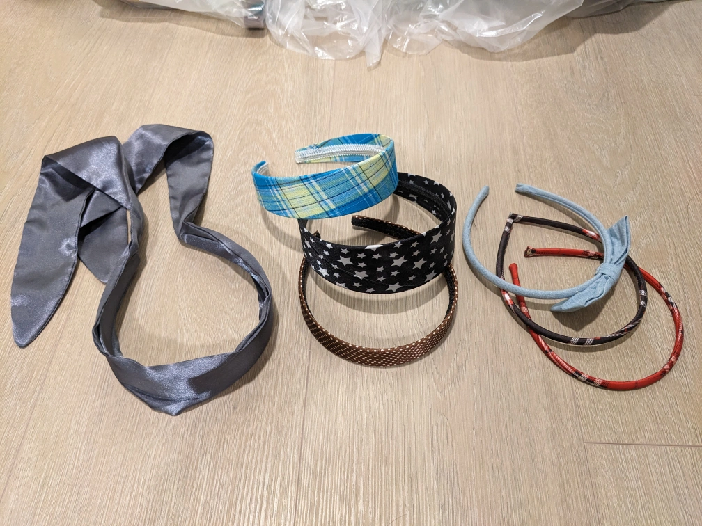 A collection of cute headbands to add some flair to your outfits! There's a variety of styles and colours to choose from, including a grey headband with ribbon tie, a blue plaid headband, a black headband with white stars, a brown polka dot headband, and some other fun designs. Perfect for everyday wear or special occasions! $5 each or all for $15 Meet at Gilmore station
