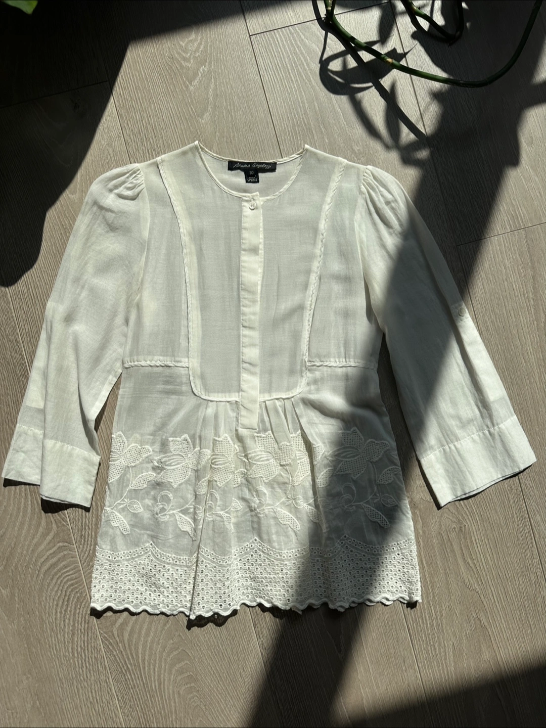 Selling a lovely Sandra Angelozzi blouse in a delicate cream colour. It's made from a blend of 68% cotton and 32% silk, giving it a light and airy feel. The size is 30.