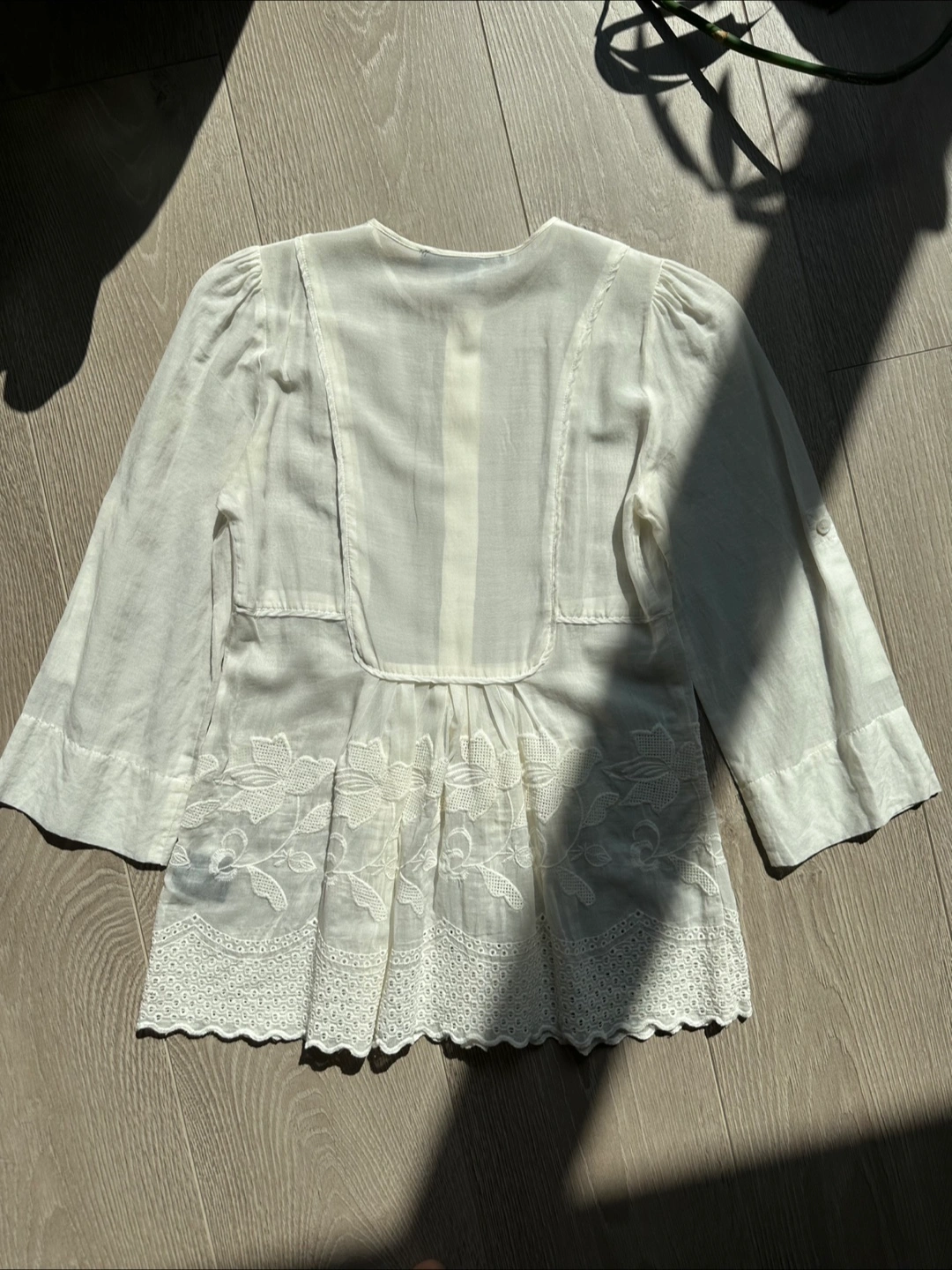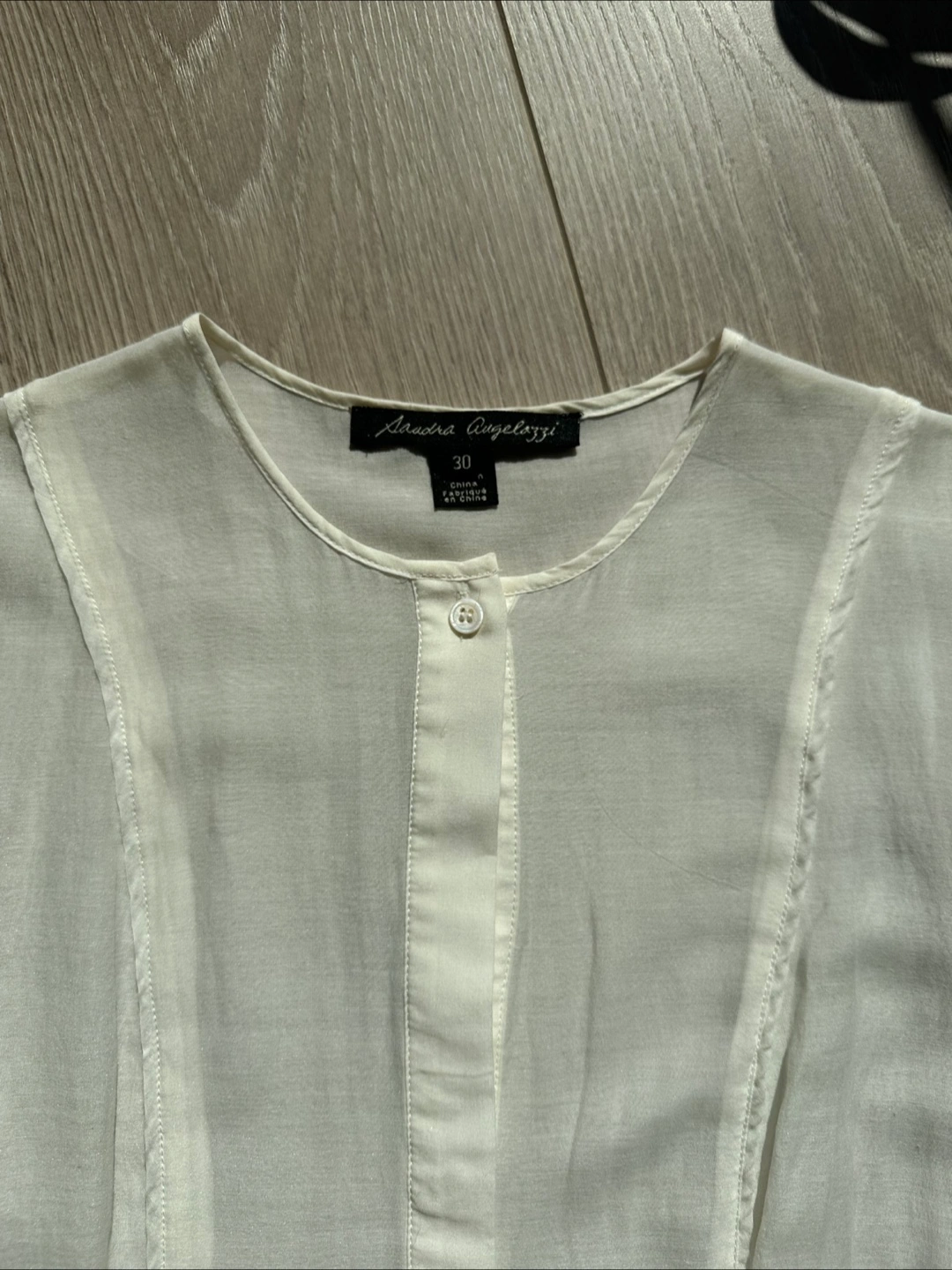 Selling a lovely Sandra Angelozzi blouse in a delicate cream colour. It's made from a blend of 68% cotton and 32% silk, giving it a light and airy feel. The size is 30.
