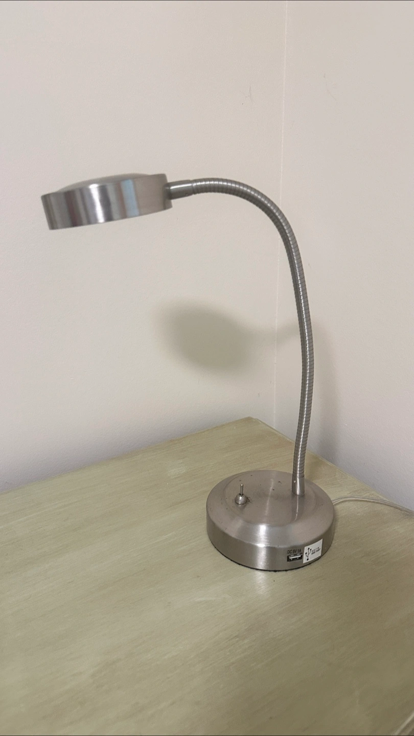 Selling a silver gooseneck Les desk lamp built in USB Port.It's in great shape and perfect for a desk or bedside table. It has a flexible neck so you can adjust the light to just the right spot.
