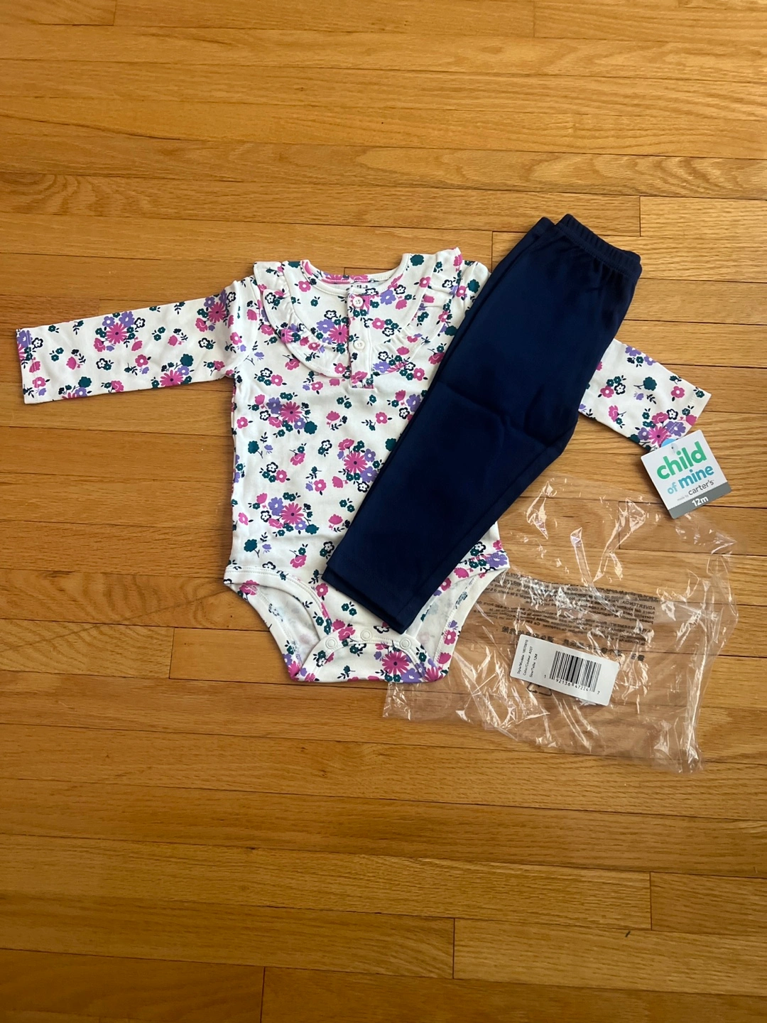I'm selling a brand new Child of Mine by Carter's baby outfit! It includes a long-sleeved floral bodysuit and navy blue pants, both in size 12 months. Perfect for your little one! Port union/401/Pickering for porch pick up