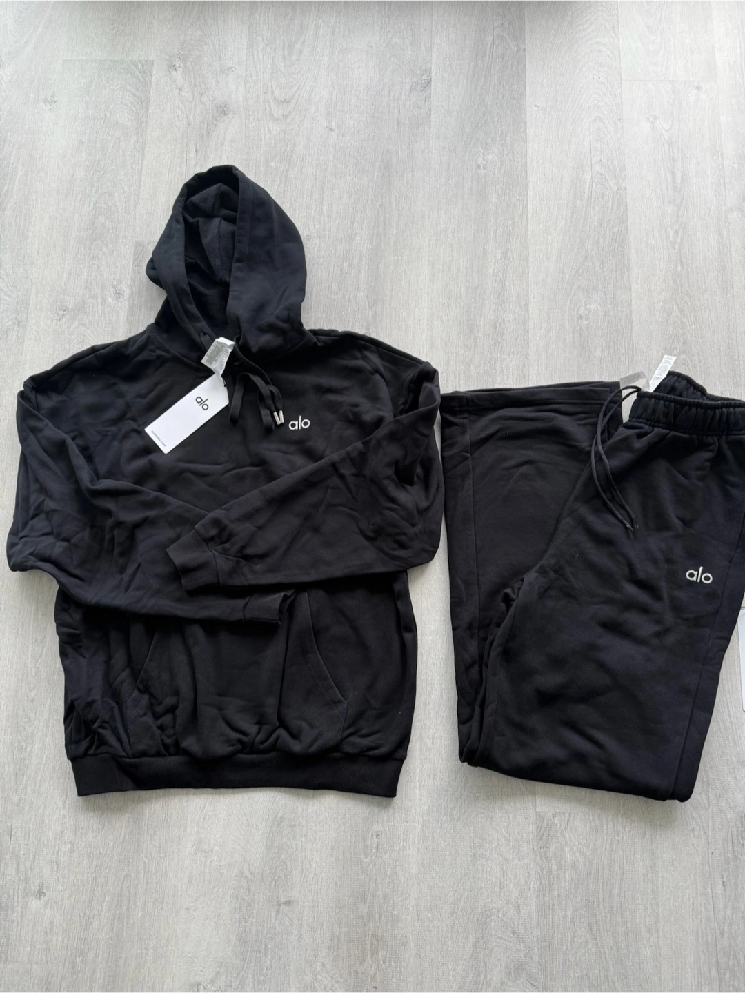 Selling a comfy black sweatpants and hoodie set from ALO. Brand new and authentic with tags The material is soft with fleecy and perfect for lounging or working out. Both pieces feature the ALO logo. Great for staying cozy this fall! Retails 400++!