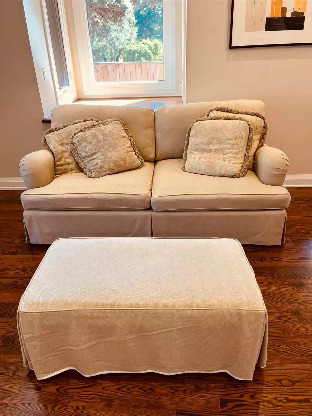 41Selling a comfy loveseat sofa with a matching ottoman. It's a great set for a smaller living space or apartment. The cushions are soft and the fabric is in good condition. Perfect for relaxing after a long day!