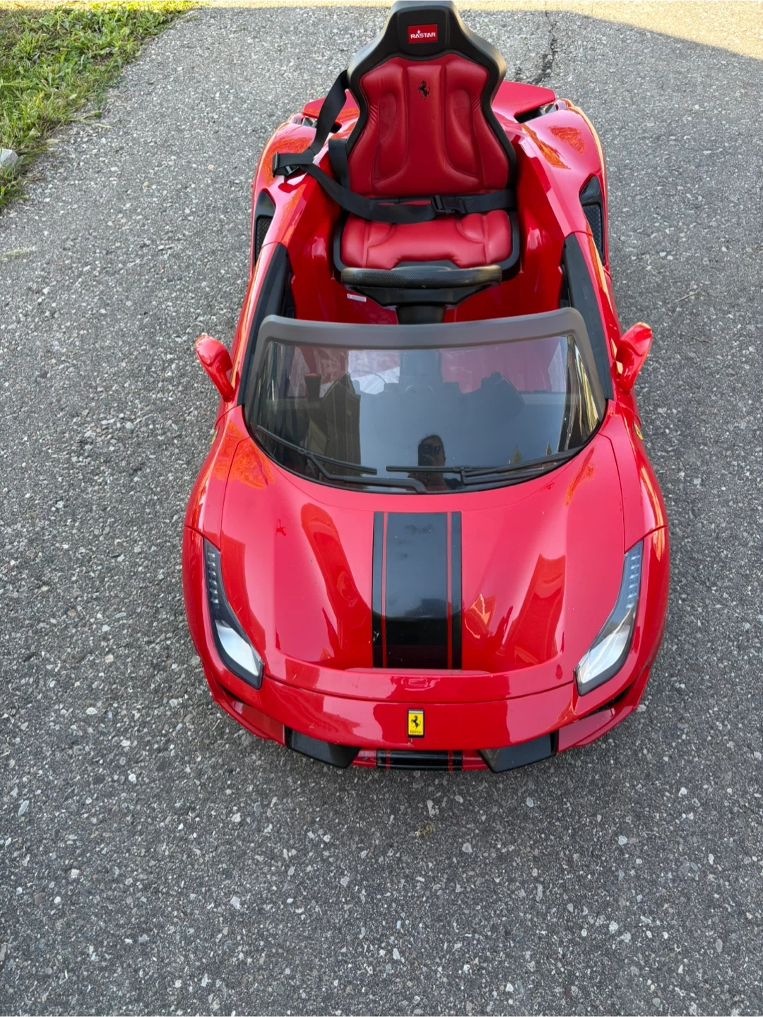 Description: Brand new, never used Rastar licensed Ferrari 488 Pista Spider electric ride-on car. • Comes with charger and remote control • Remote control requires 2 x 1.5V AA batteries (not included) • Suitable for kids 3+ years • Opening doors, seat belt, leather-look seat • LED headlights, music and sound effects • 2.4GHz parental remote control • Realistic Ferrari design 🔋 Battery Information • Type: Lithium-ion (Li-ion 18650) • Capacity: 4000 mAh • Voltage: 11.1V (in the 12V category) • Recharge Cycles: Over 500 times ⏱️ Charging Time • Recommended full charge: 5–6 hours • Do not use the car for more than 60 minutes while charging ⚡ Usage Time • A full charge typically provides 1–2 hours of driving (depending on child’s weight, speed setting, and terrain). 🚗 Motor Power & Speed • Motors: DC 11.1V 25W × 2 • Speed: 3–4 km/h 🌡️ Operating Temperature • Recommended range: 5°C – 35°C 👉 The car is brand new. 👉 Final price, no negotiation.