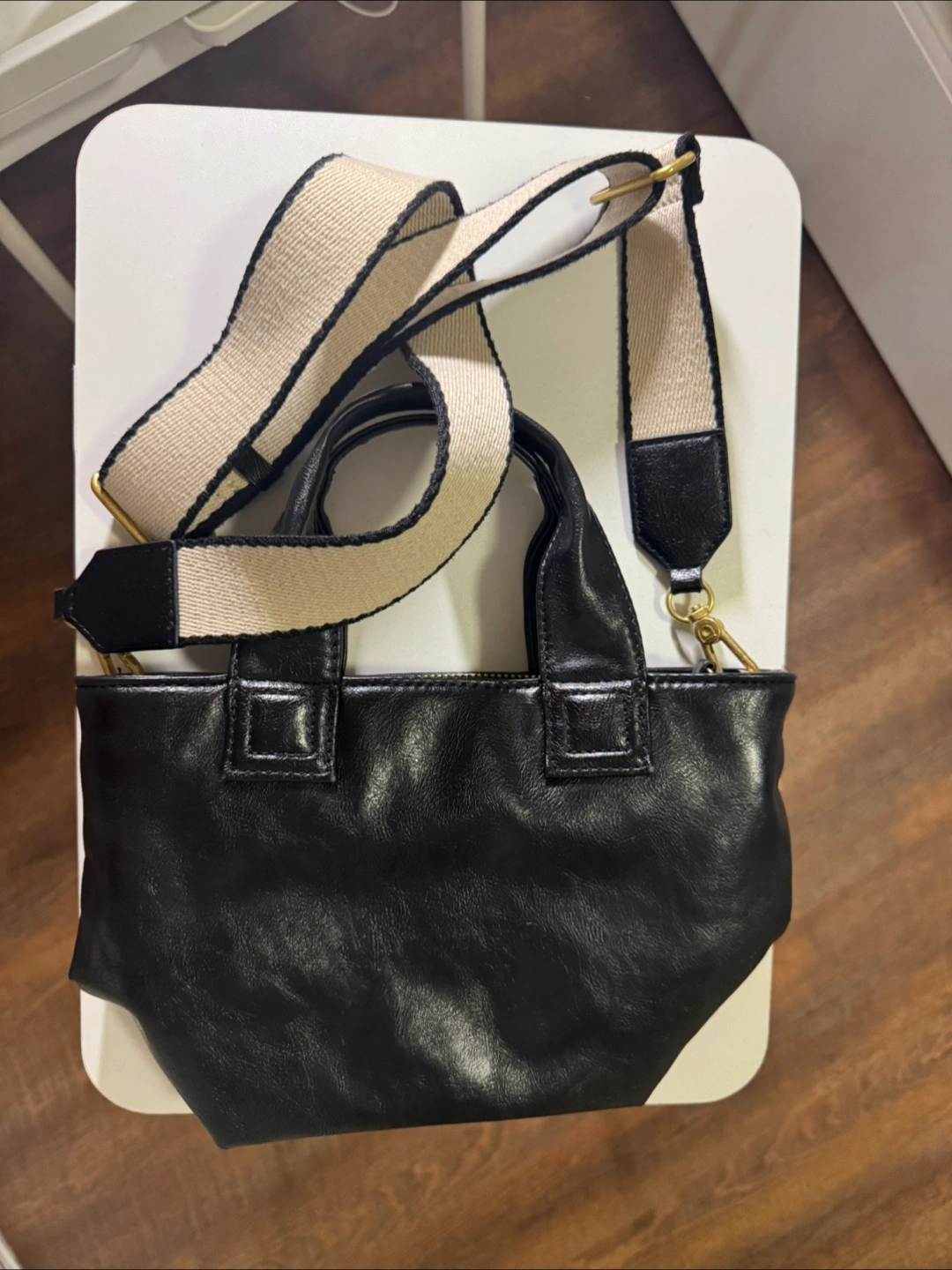 A cute black leather tote bag is up for grabs! It comes with a stylish strap. It's in great condition and ready for a new home!