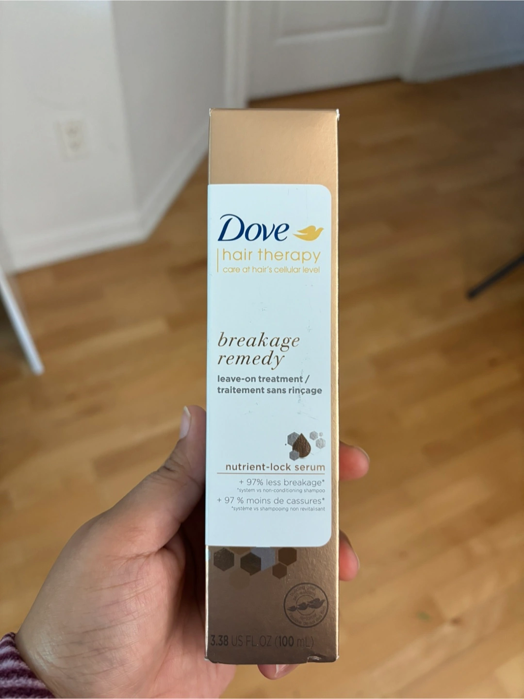 Dove Hair Therapy Breakage Remedy leave-in treatment is a nutrient-lock serum that helps with hair breakage. The bottle contains 100 mL (3.38 US fl oz). Sealed. Never opened.