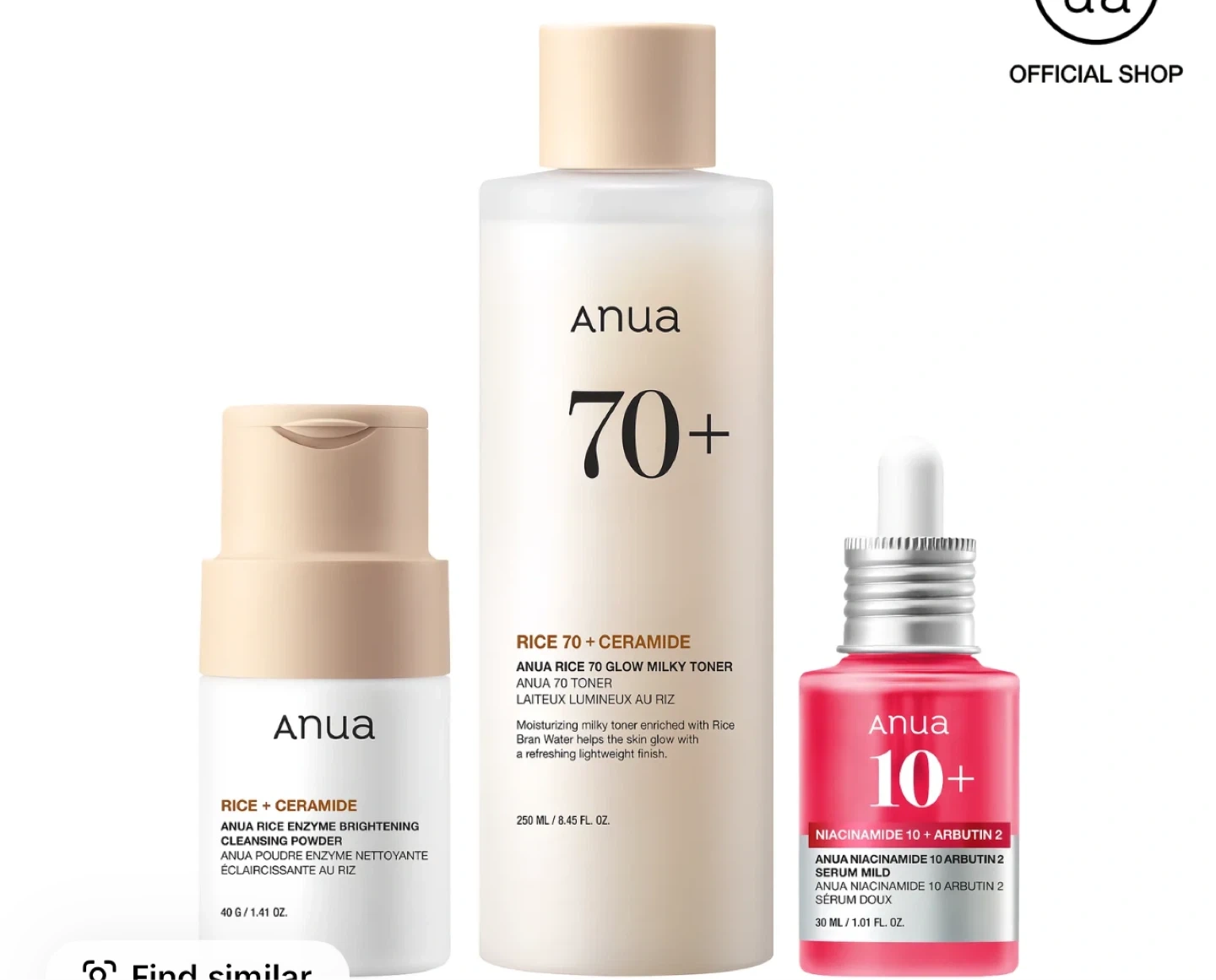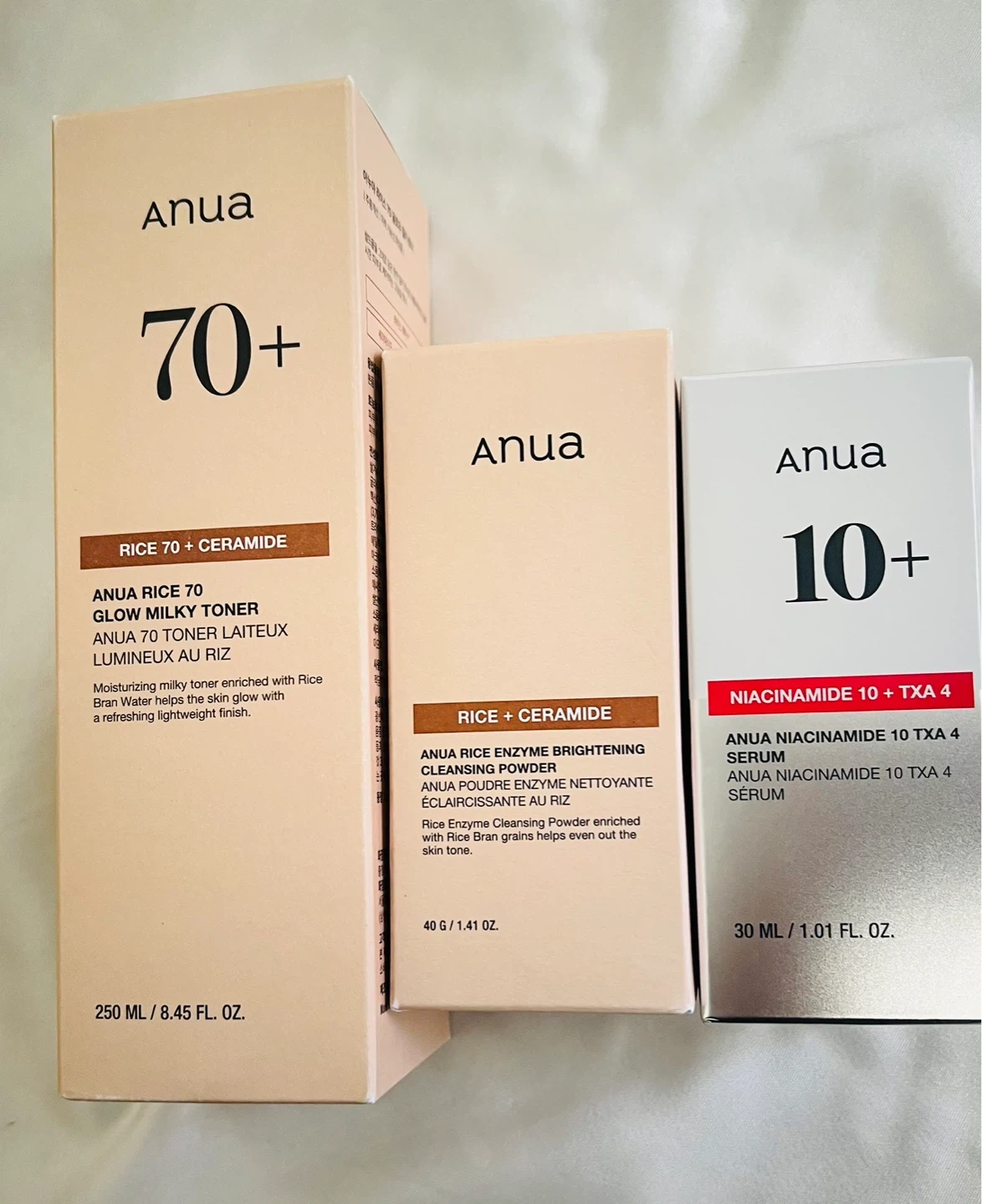 70Selling an Anua skincare set that includes: - Anua Rice Enzyme Brightening Cleansing Powder - Anua 70+ Rice + Ceramide Glow Milky Toner - Anua 10+ Niacinamide 10 + Arbutin 2 Serum All items are new and come in their original boxes!