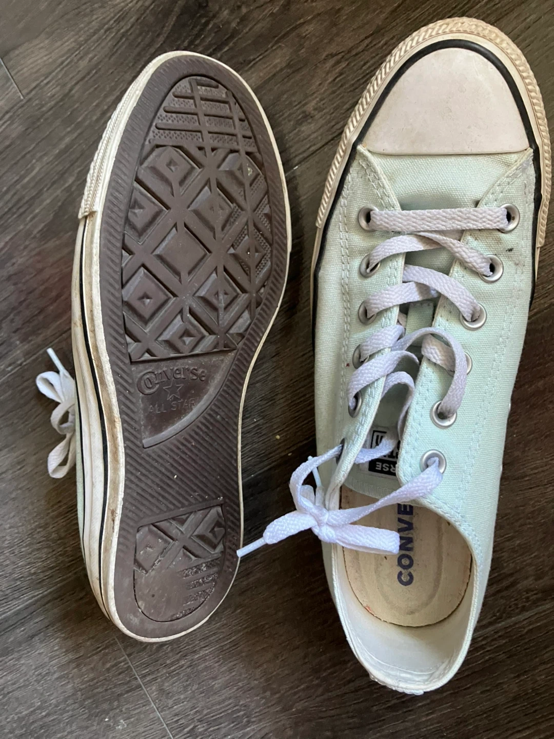 Converse All Star low top sneakers. They're a lovely light mint green colour and in great condition. Size is a women's10