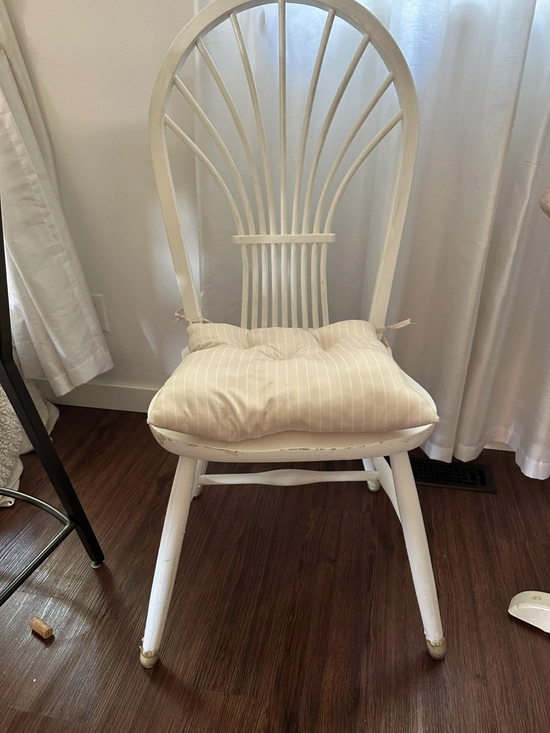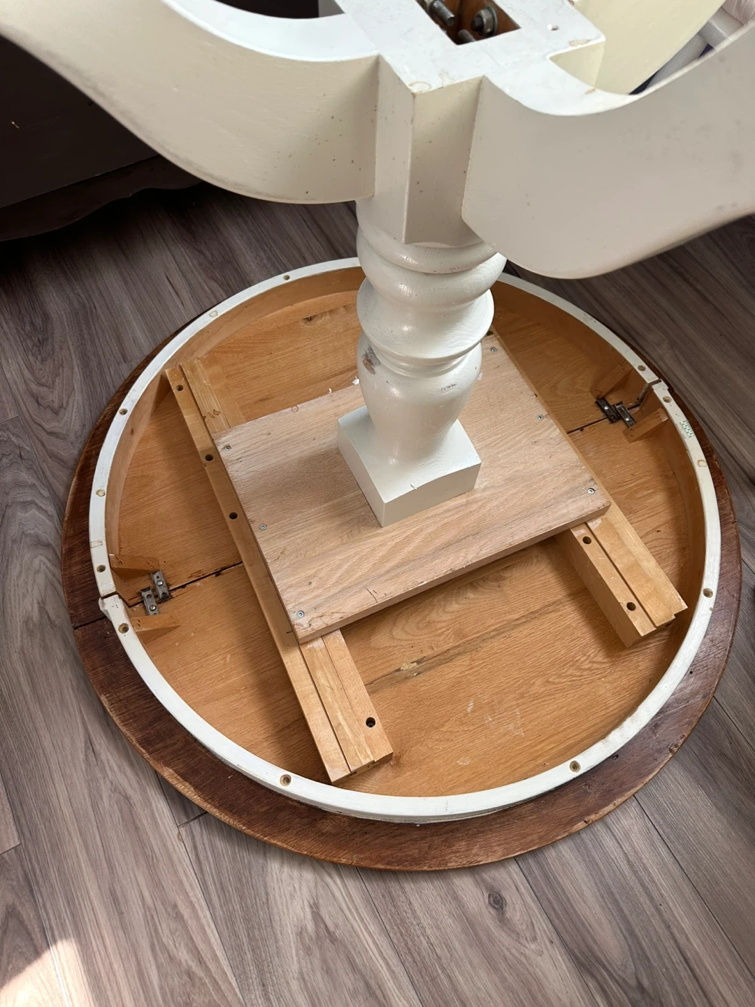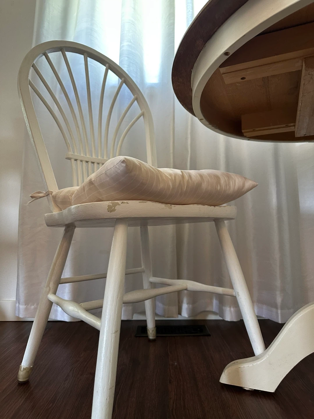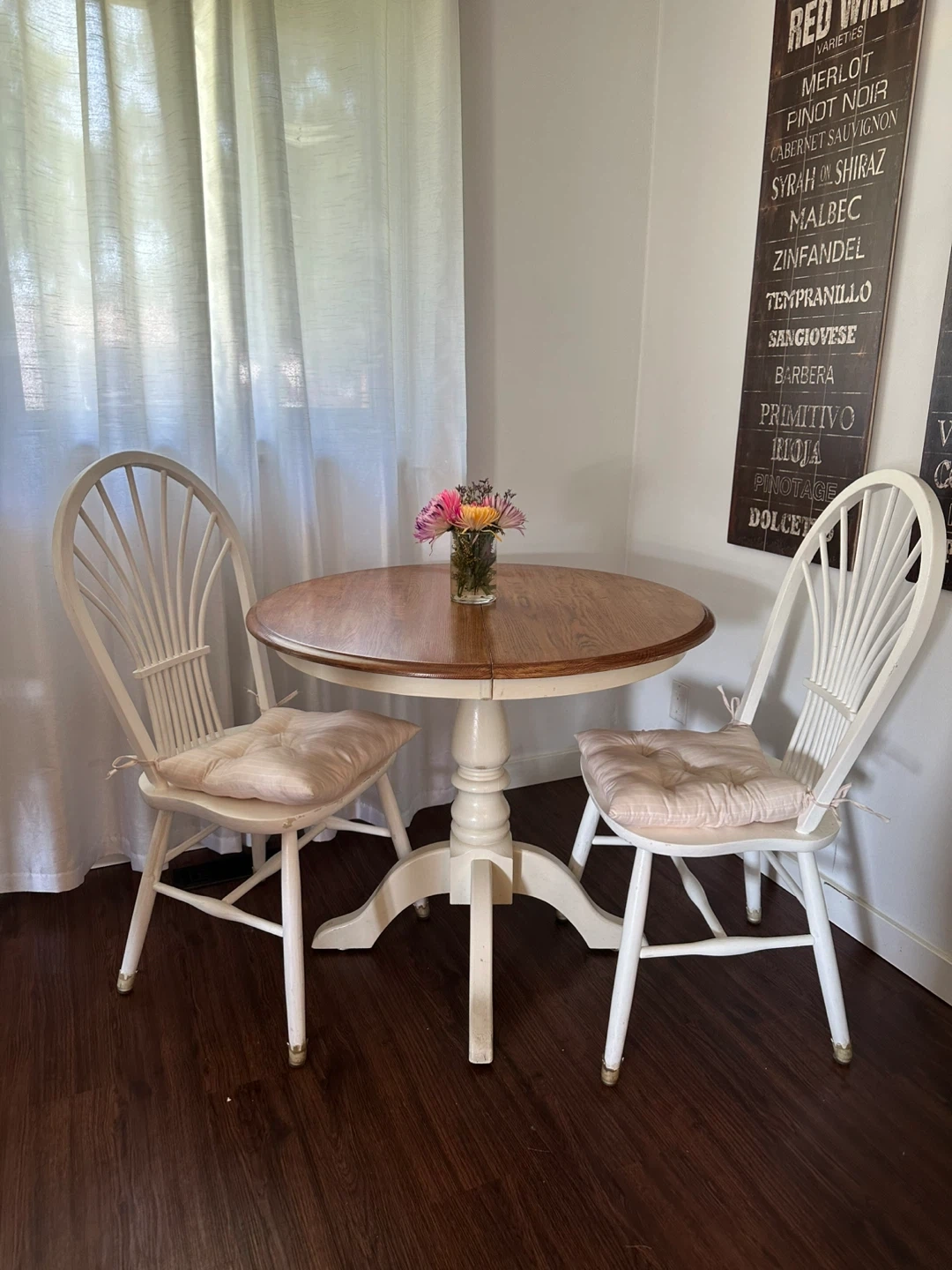 Selling a charming round dining table with two matching chairs! The table has a wooden top and a white base. The chairs are white with cushioned seats for extra comfort. The chairs and table have been painted white a refinished. Perfect for a cozy dining space! The table does not have an extender that goes in it and does not fold.