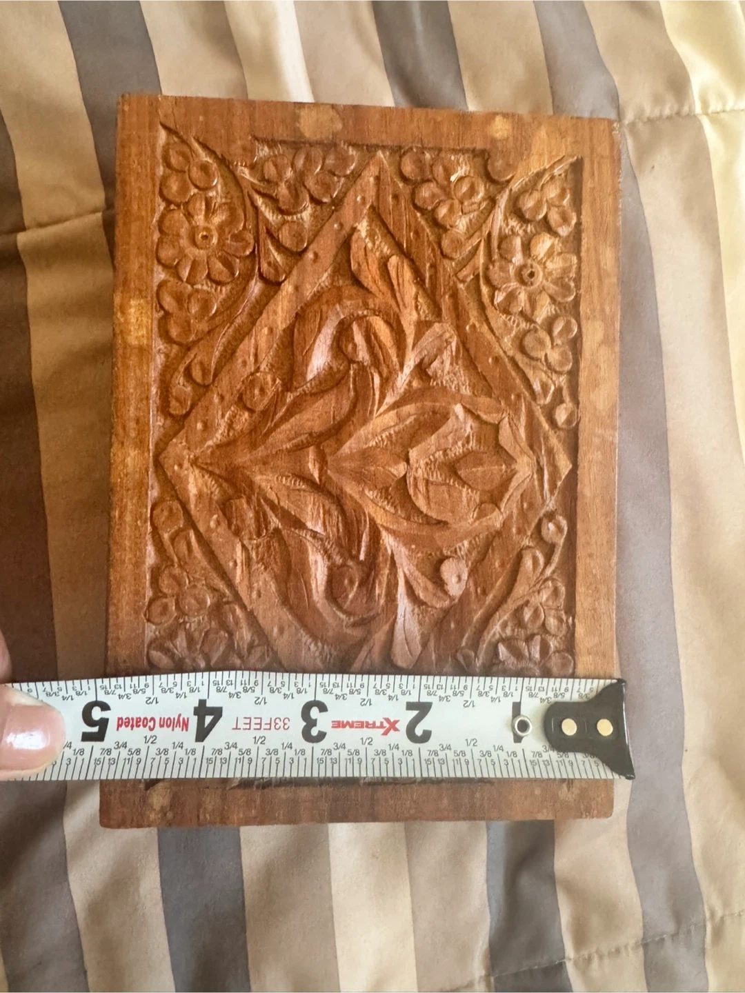 Selling a lovely carved wooden box! It has a beautiful floral design and a red felt lining inside. The box is about 7 inches long and 5 inches wide, perfect for storing small treasures or keepsakes