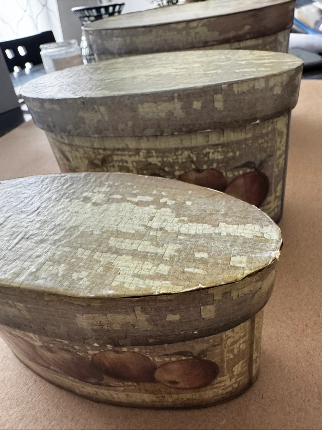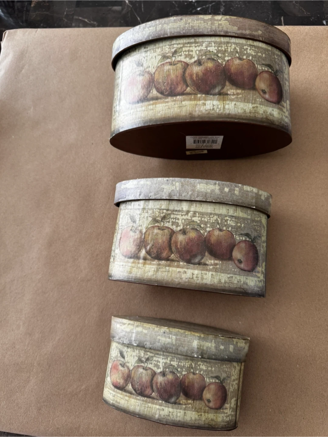 Selling a set of three decorative nesting boxes. They have an apple design and an oval shape. They would look great as a decorative piece in your home!