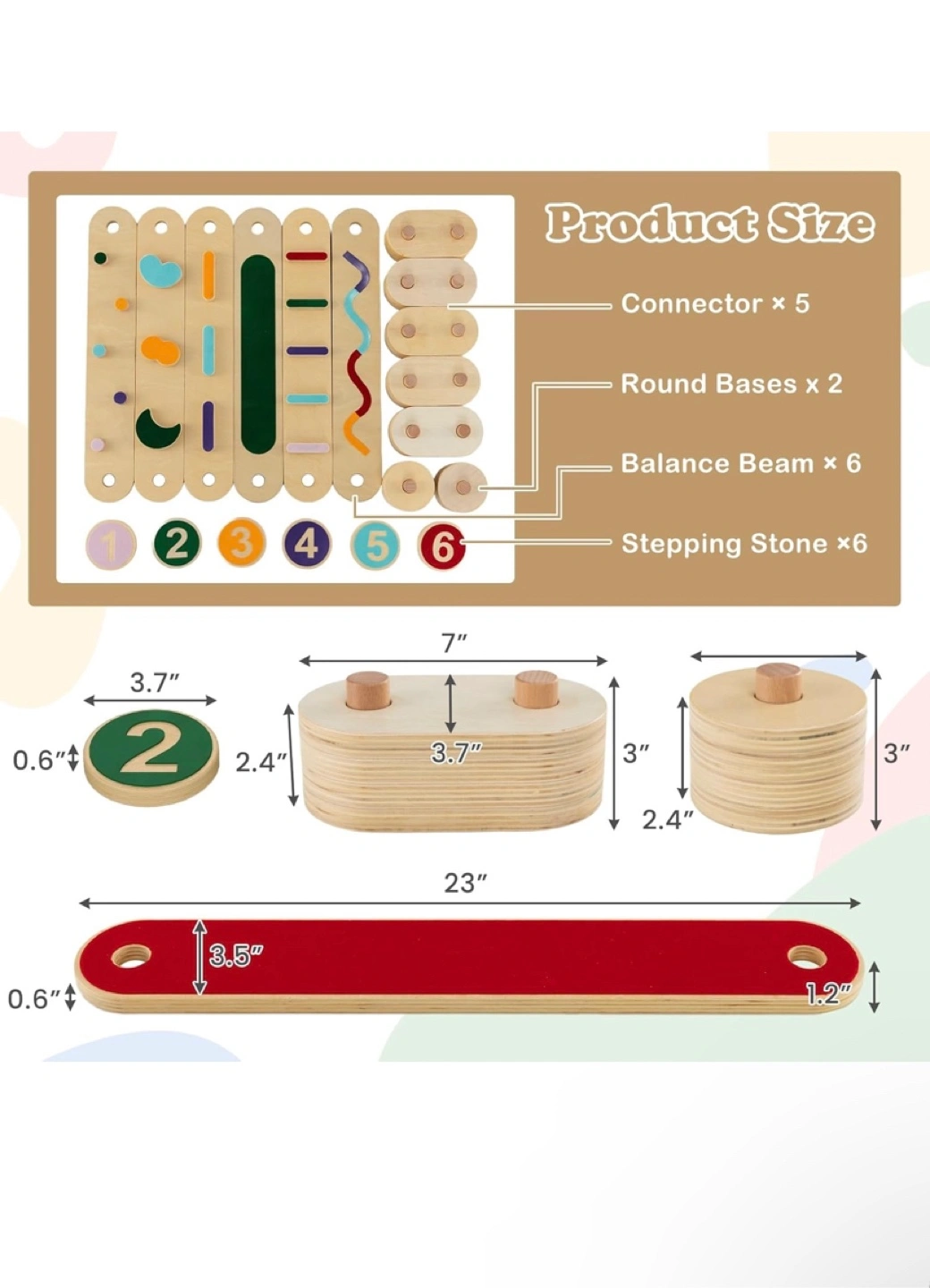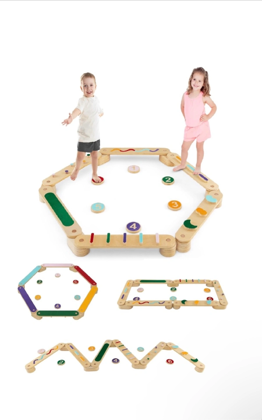 This wooden balance beam toy is a fun way to help develop your child's balance and coordination! It features felt surfaces and obstacles for an engaging play experience. The pieces can be arranged in multiple ways to create different paths and shapes, such as a pentagon, hexagon, triangle, quadrilateral, or curve. The toy is made with safe and durable materials, including burr-free edges and a thickened panel.