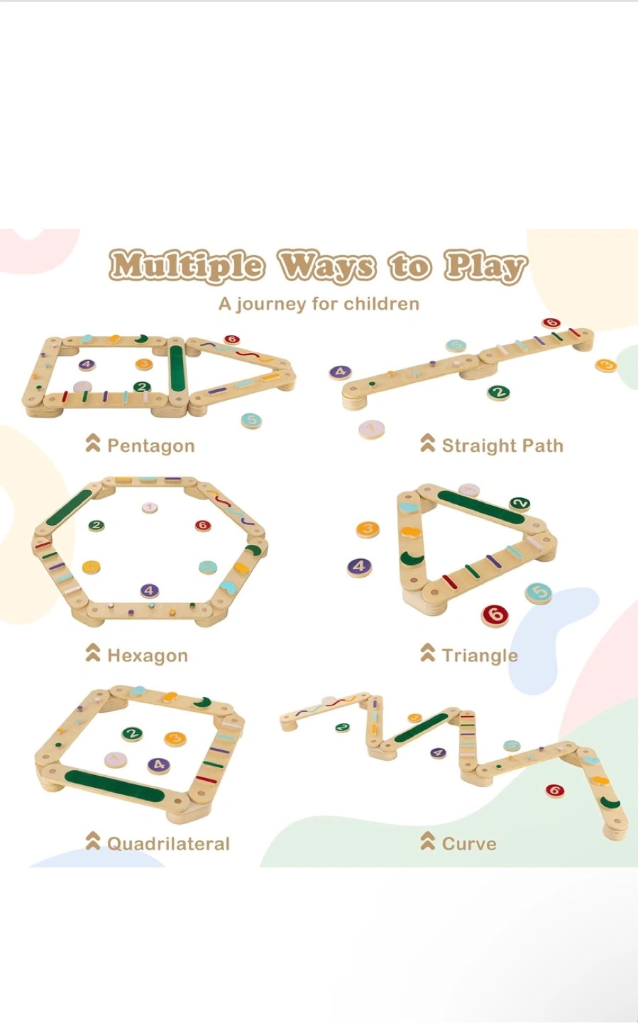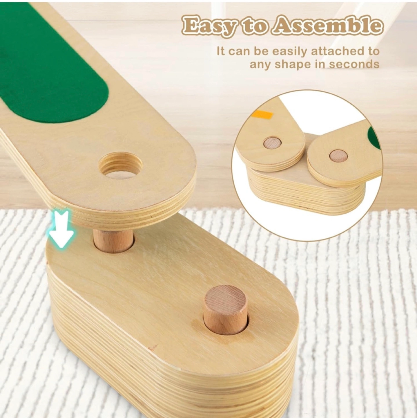 This wooden balance beam toy is a fun way to help develop your child's balance and coordination! It features felt surfaces and obstacles for an engaging play experience. The pieces can be arranged in multiple ways to create different paths and shapes, such as a pentagon, hexagon, triangle, quadrilateral, or curve. The toy is made with safe and durable materials, including burr-free edges and a thickened panel.