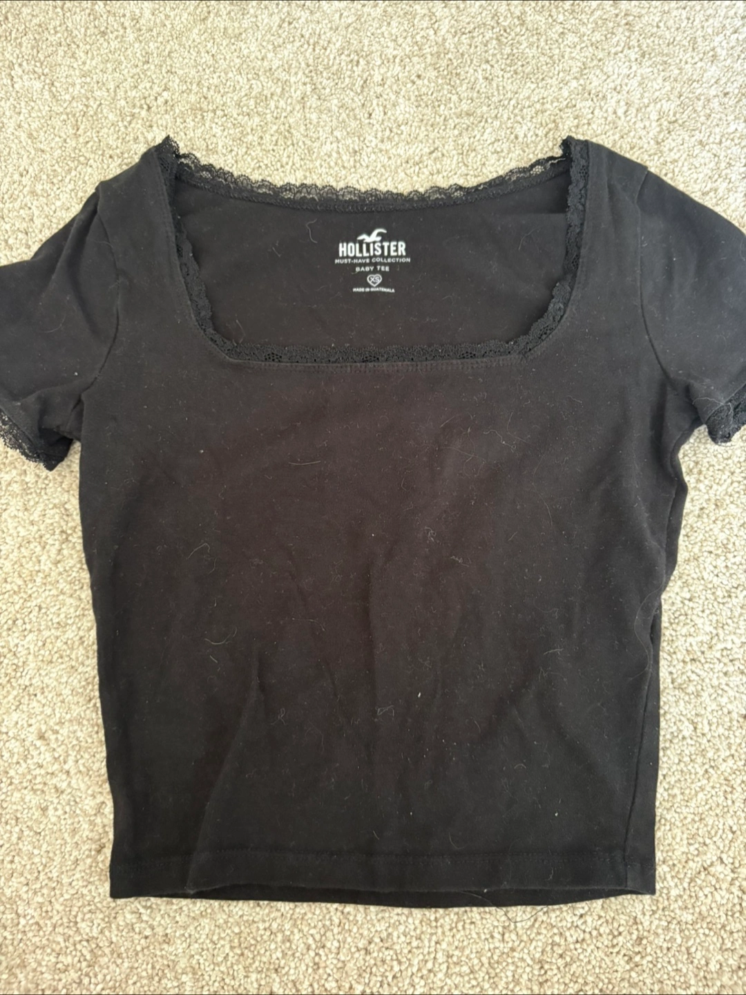 Hollister baby tee in black with lace trim. It's a size small and in great condition!