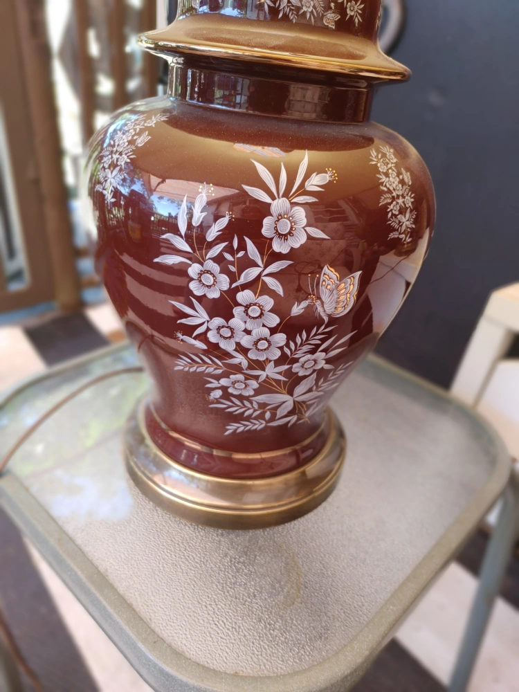 Selling a beautiful vintage table lamps! It features a lovely brown colour with delicate floral and butterfly designs. The lamp has a classic shape and a gold-tone base and top accent. Would look great in any room! shades are excellent condition!! no tears chips or stains