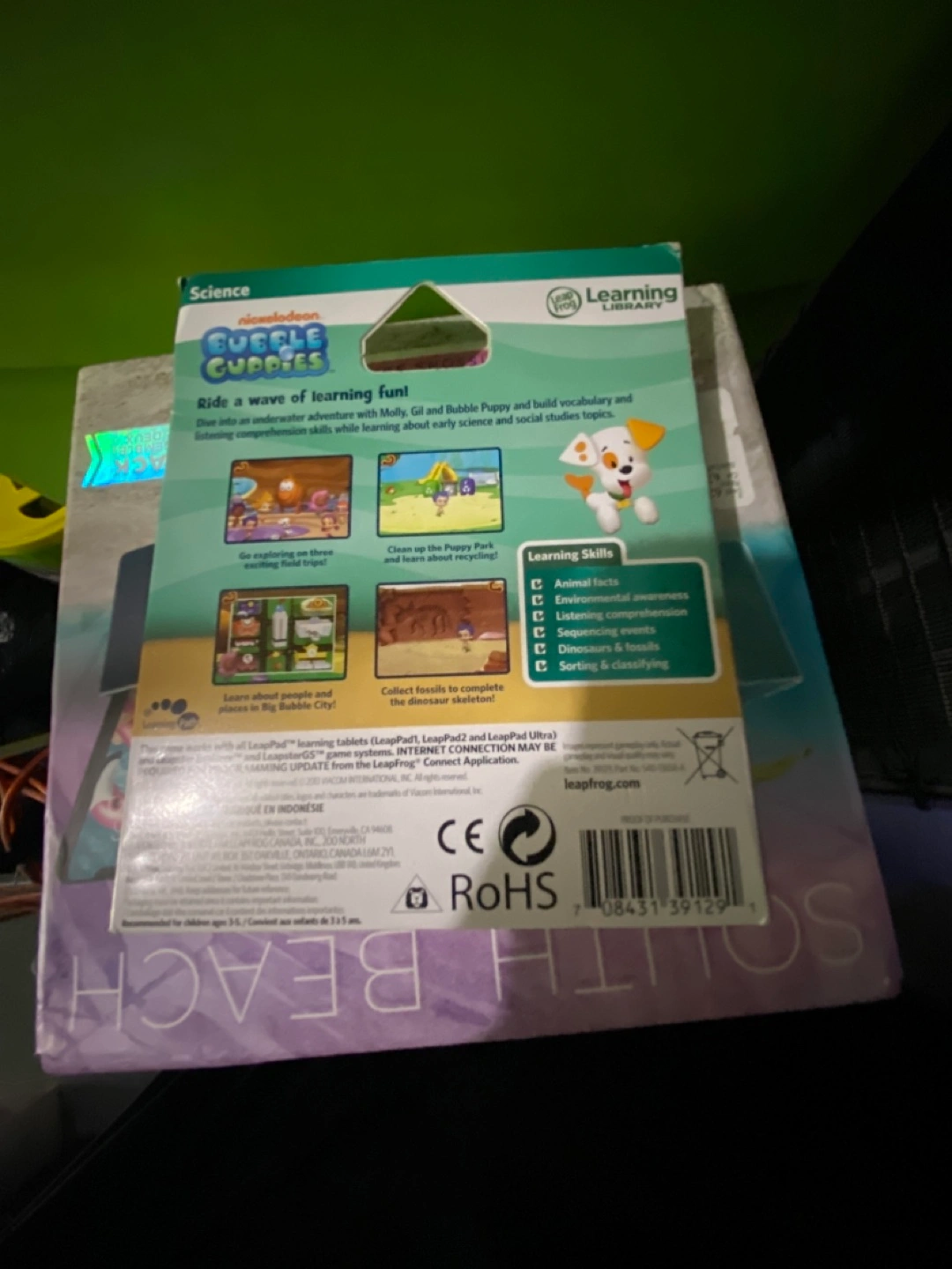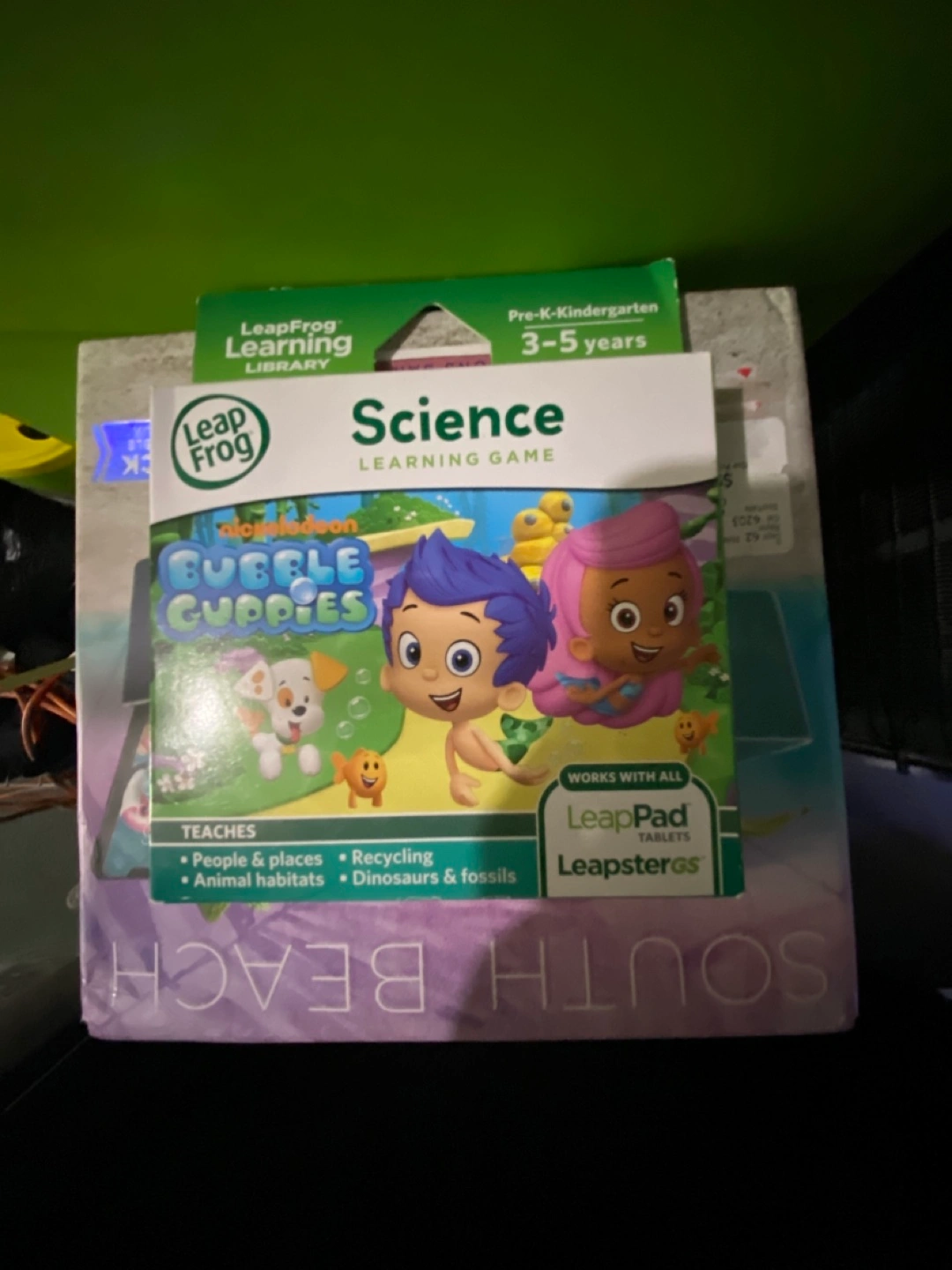 I'm selling a LeapFrog Learning Game: Bubble Guppies! It's a science learning game designed for pre-K to kindergarten, ages 3-5 years. It teaches about people & places, animal habitats, recycling, and dinosaurs & fossils. Works with LeapPad tablets and LeapsterGS.