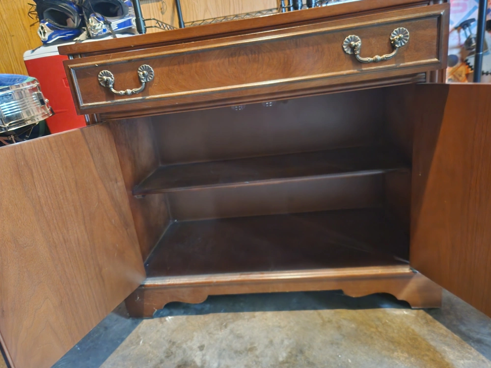 Selling a wooden cabinet with a drawer and two doors. It has a classic design with ornate drawer pulls. There's some wear, but it's still a sturdy piece of furniture that would look great in any room! and I has rollers on bottom so it moves around