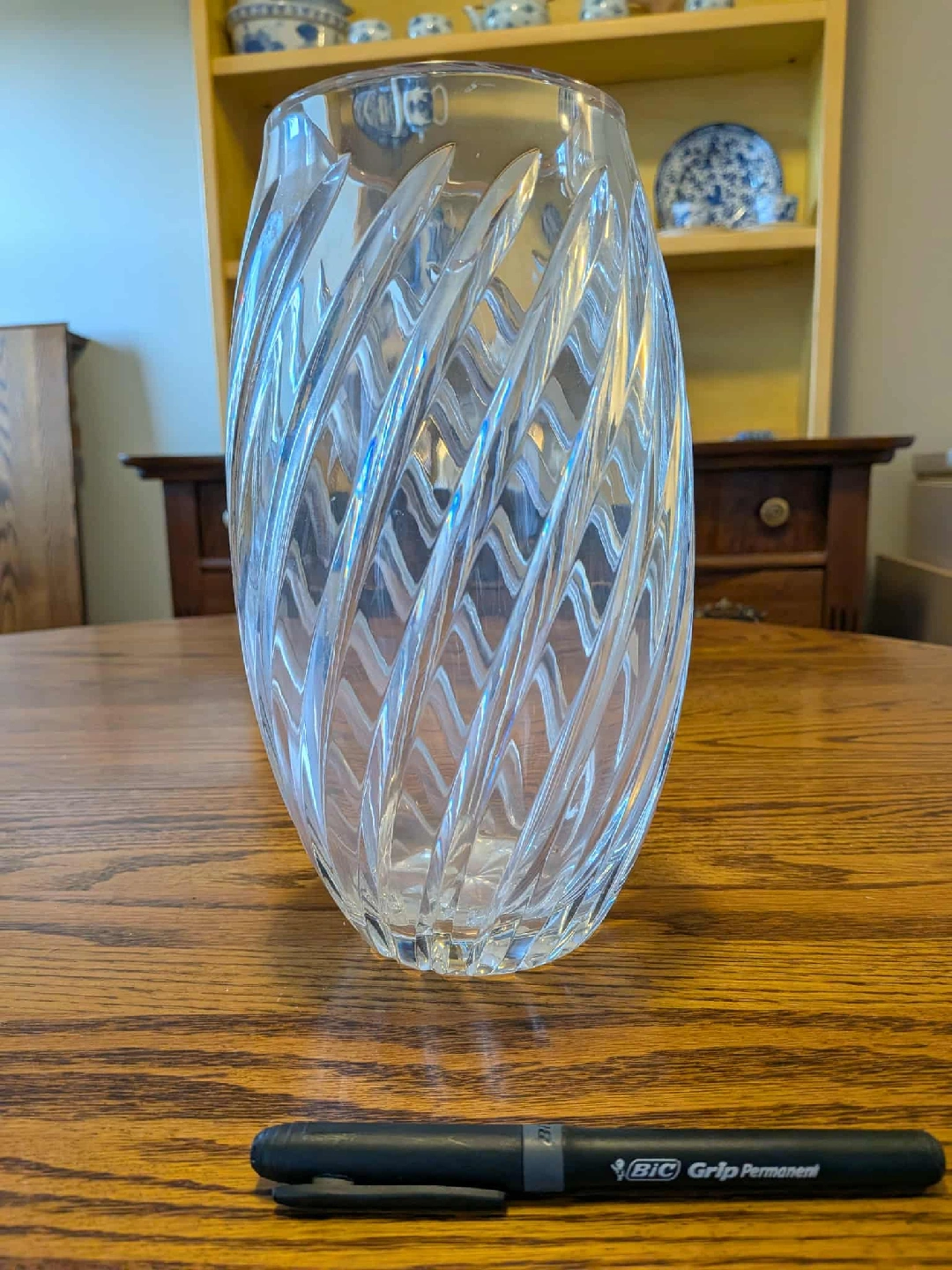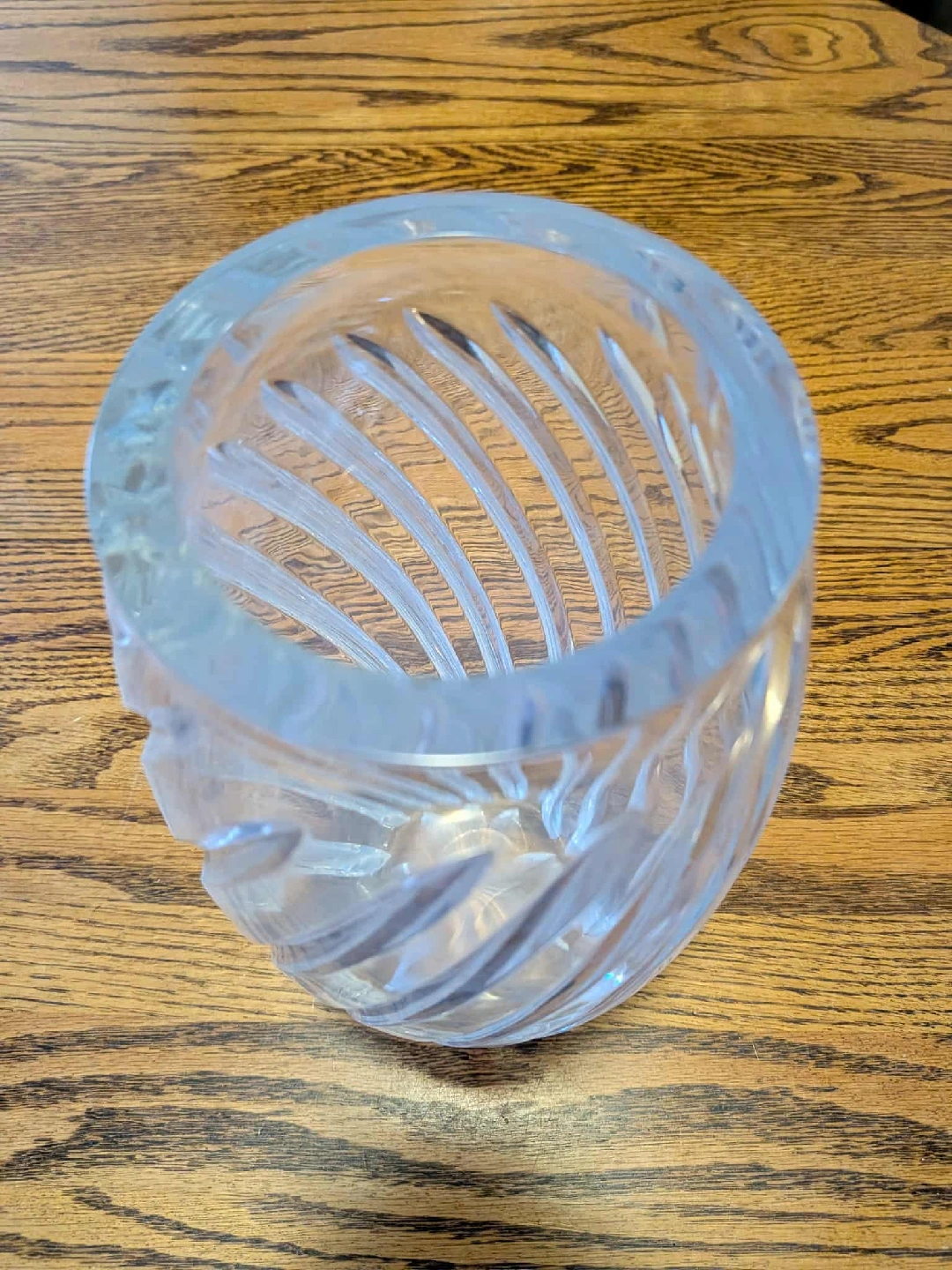 Here's a beautiful crystal vase that would look great in any home! It has an elegant design with swirling patterns. It's in excellent condition and ready to add a touch of class to your decor