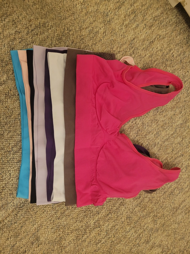 I'm selling a collection of sports bras in various colours. They are new. Perfect for workouts or everyday wear! All for $10, less than $2 each. There is 12