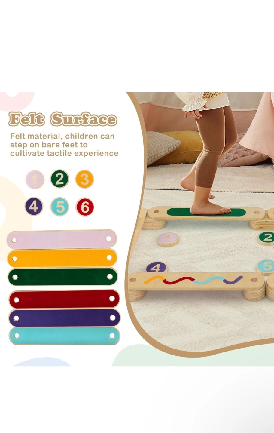 This balance beam set is perfect for kids! It helps develop their balance and coordination skills. The set includes various shapes and felt surfaces with and without obstacles for an upgrade play experience. It features safe and durable details like burr-free edges and a thickened panel
