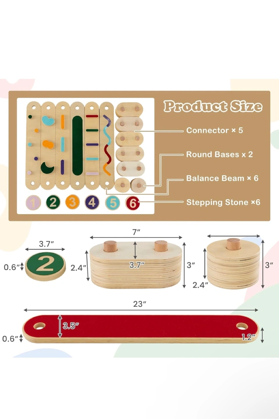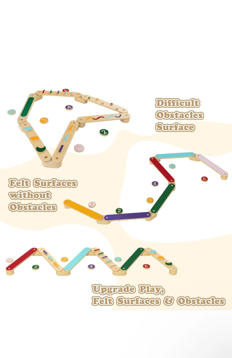 This balance beam set is perfect for kids! It helps develop their balance and coordination skills. The set includes various shapes and felt surfaces with and without obstacles for an upgrade play experience. It features safe and durable details like burr-free edges and a thickened panel