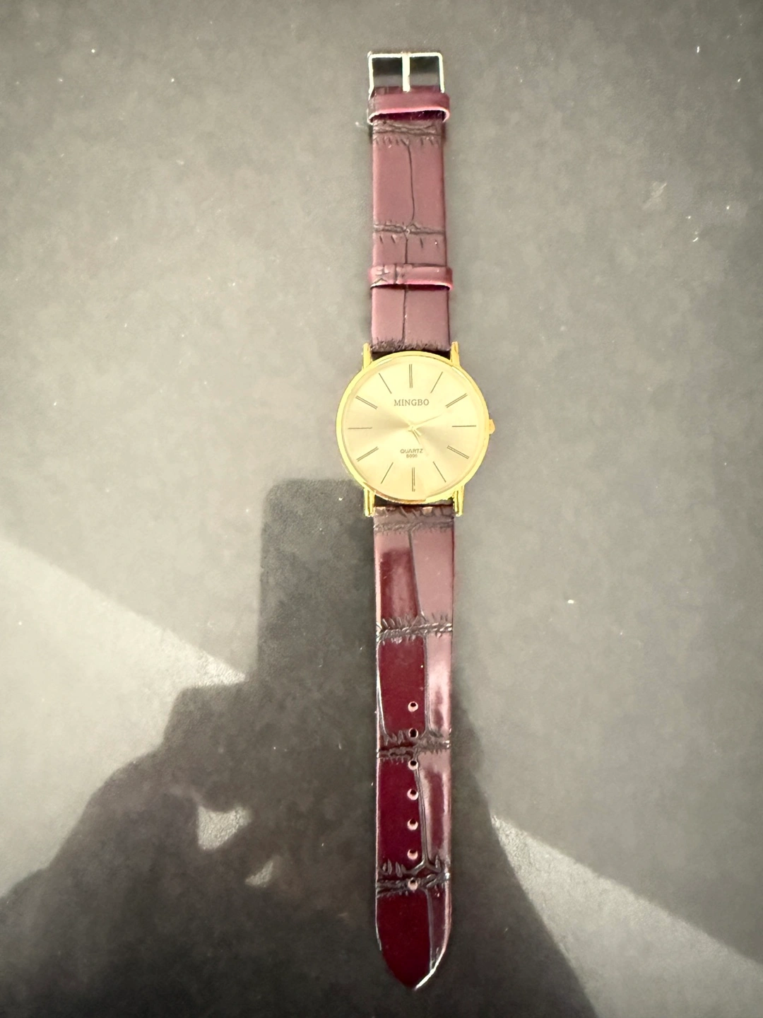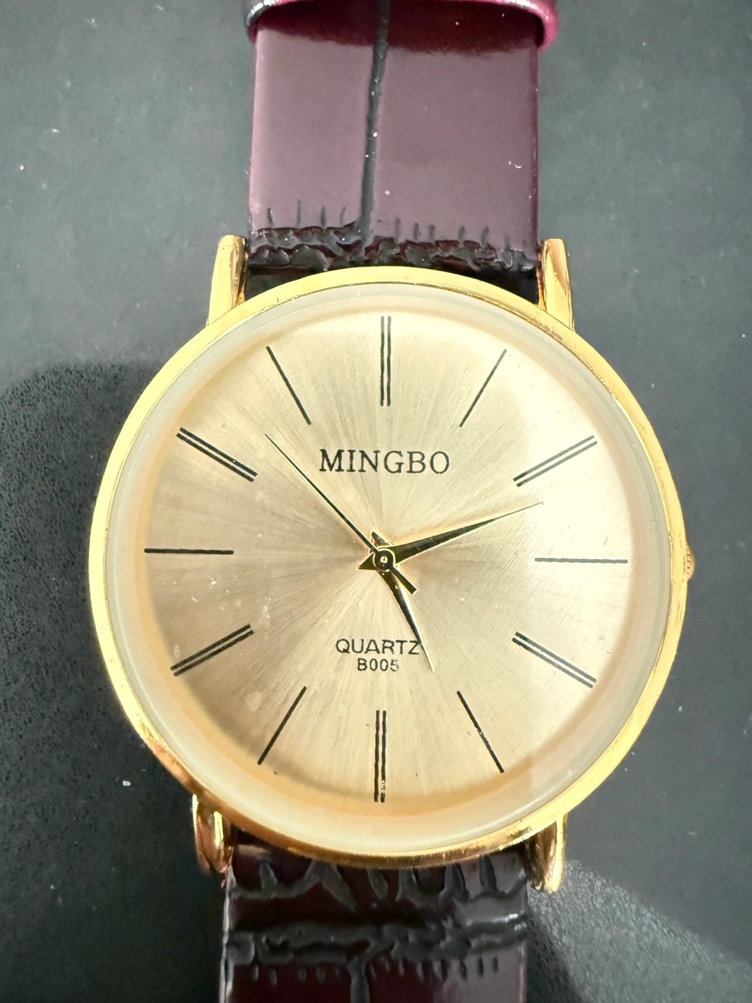 Selling a MINGBO Quartz B005 watch. The watch has a gold face and a burgundy leather strap. Feel free to ask any questions!