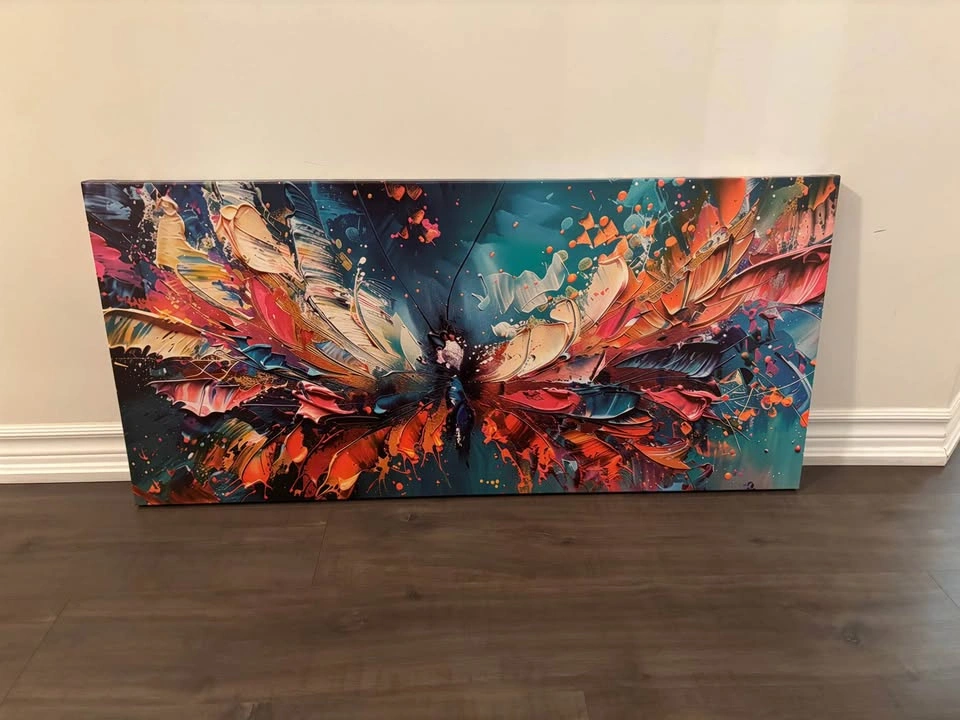 Colourful abstract butterfly print on canvas. Framed (by me) onto 42.25”x19.75” x1.5” wooden frame. Ready to hang with wire hanger attached. Pick up in North Bowmanville Check out my other listings for more canvases!