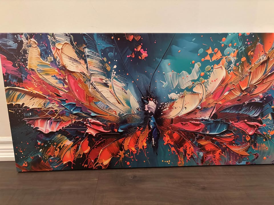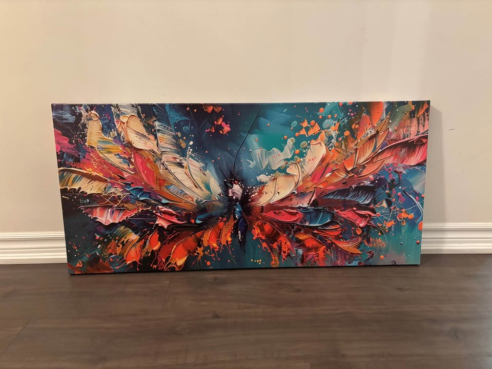 Colourful abstract butterfly print on canvas. Framed (by me) onto 42.25”x19.75” x1.5” wooden frame. Ready to hang with wire hanger attached. Pick up in North Bowmanville Check out my other listings for more canvases!