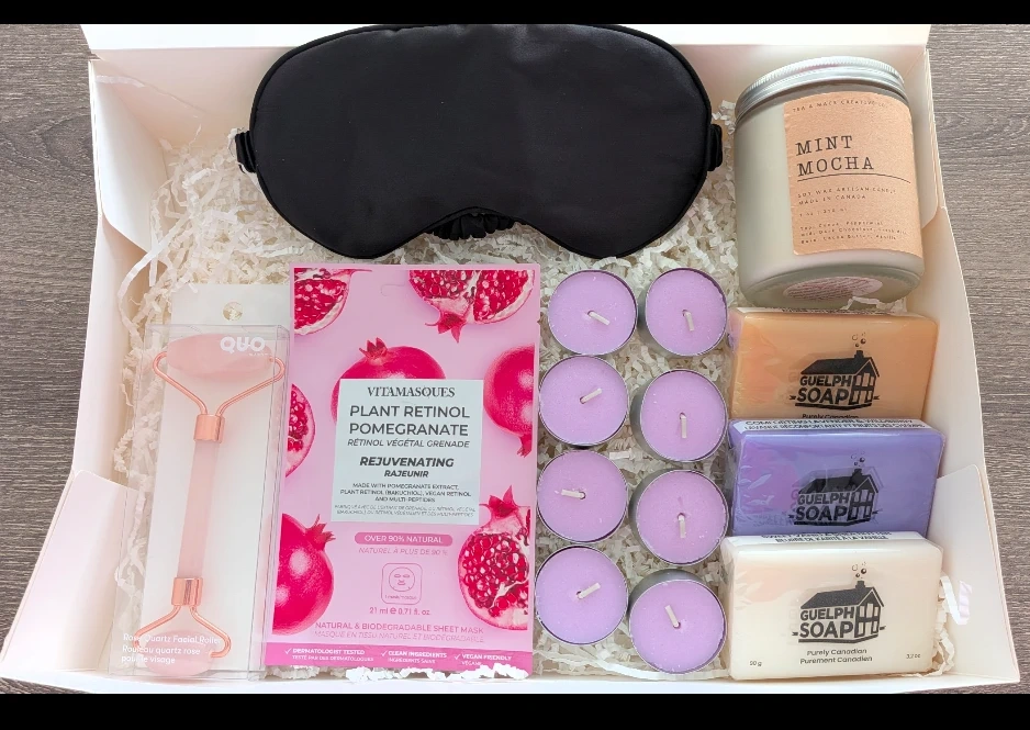 Beautifully curated self-care bundle featuring skincare tools, artisan Canadian soaps, and premium relaxation essentials. Perfect for gifting or creating your own spa night at home.