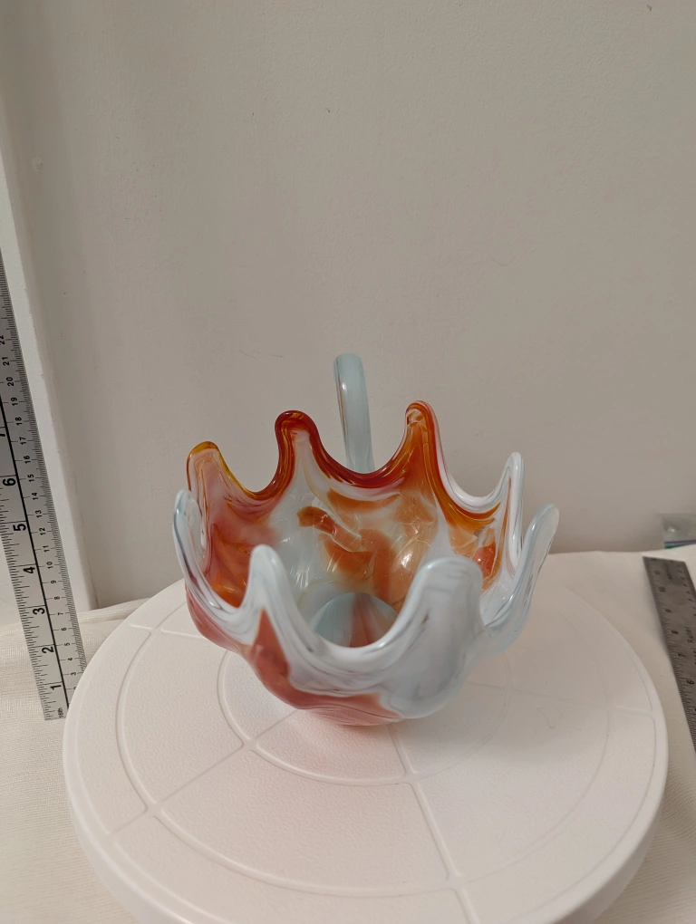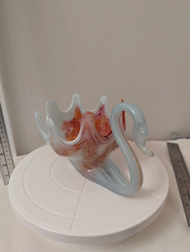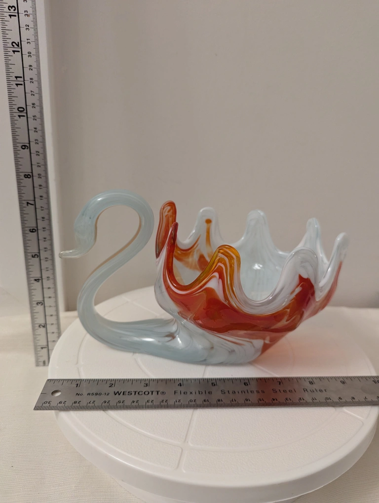 Here's a lovely large swan-shaped glass bowl. Made of Cadmium Orange & Translucent White glass. A beautiful piece for adding a touch of elegance to any room. Has a stunning marbled effect. It would look great as a centrepiece or to hold small items! 9 inches long. Glows orange under UV.