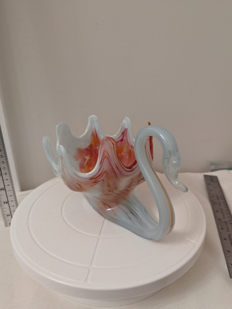 Here's a lovely large swan-shaped glass bowl. Made of Cadmium Orange & Translucent White glass. A beautiful piece for adding a touch of elegance to any room. Has a stunning marbled effect. It would look great as a centrepiece or to hold small items! 9 inches long. Glows orange under UV.